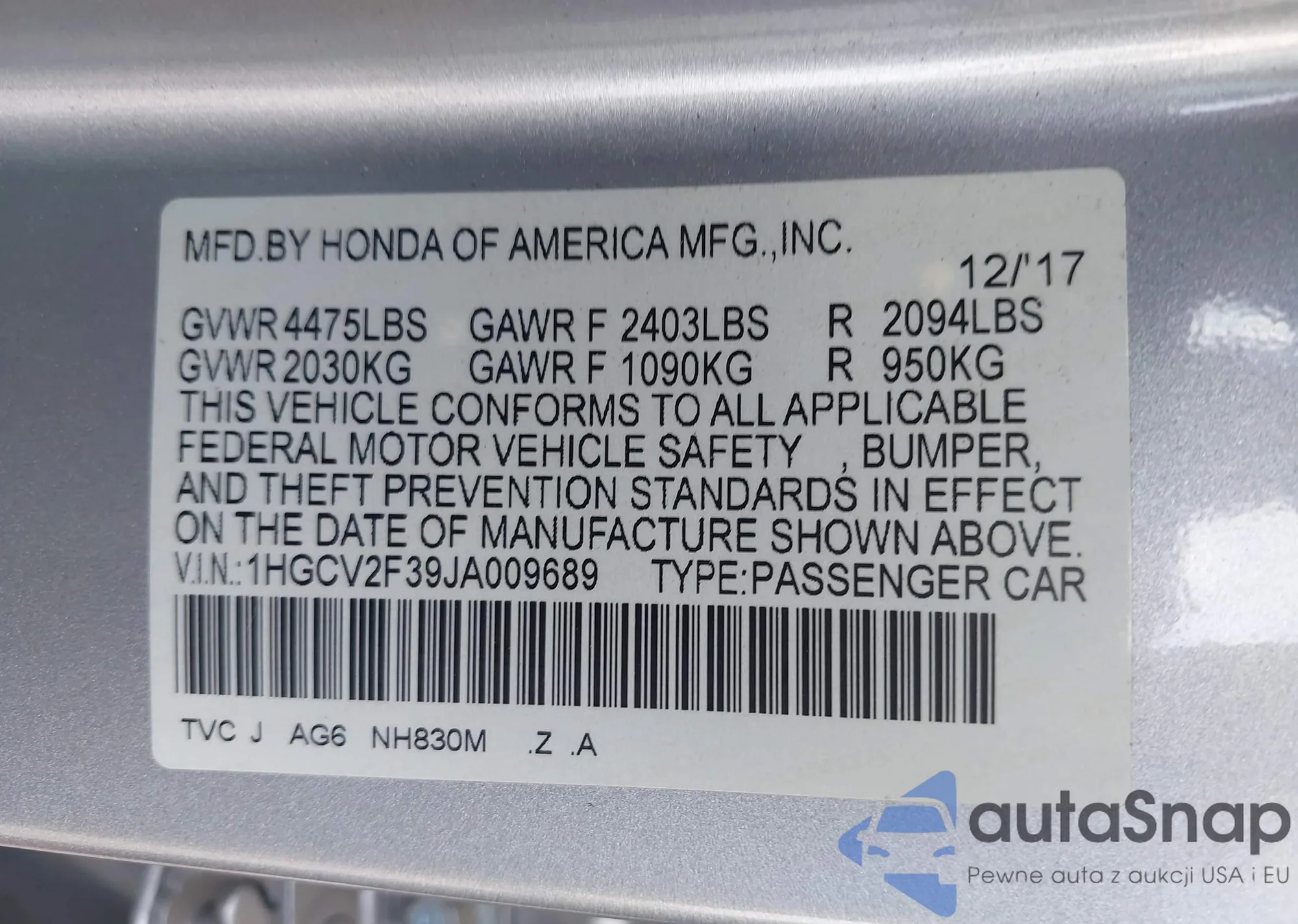 • VIN 1HGCV2F39JA009689