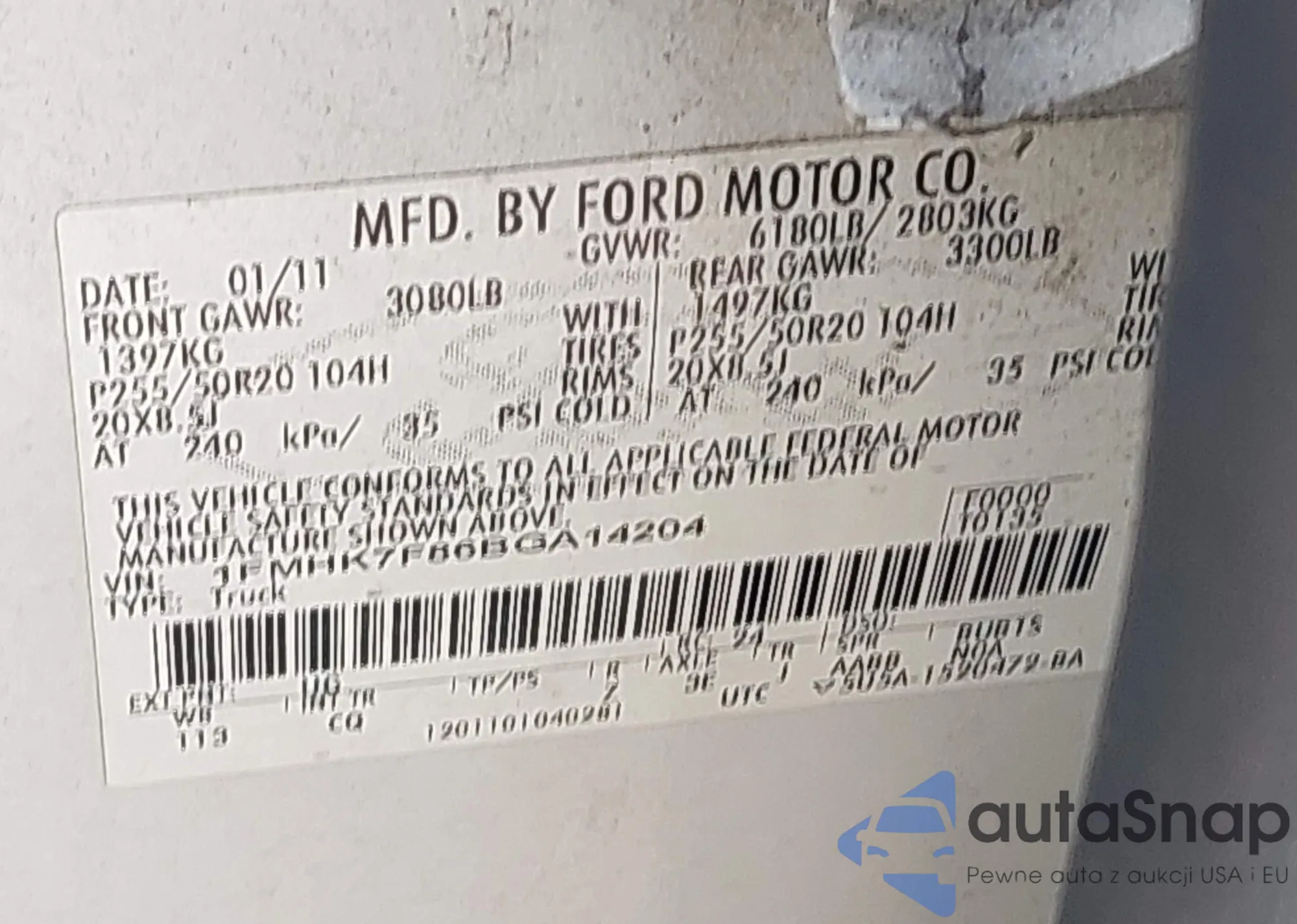 LOT: 43352540 VIN: 1FMHK7F86BGA14204