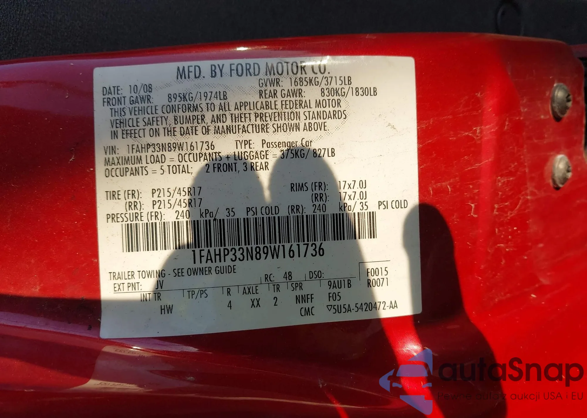 LOT: 43467625 VIN: 1FAHP33N89W161736