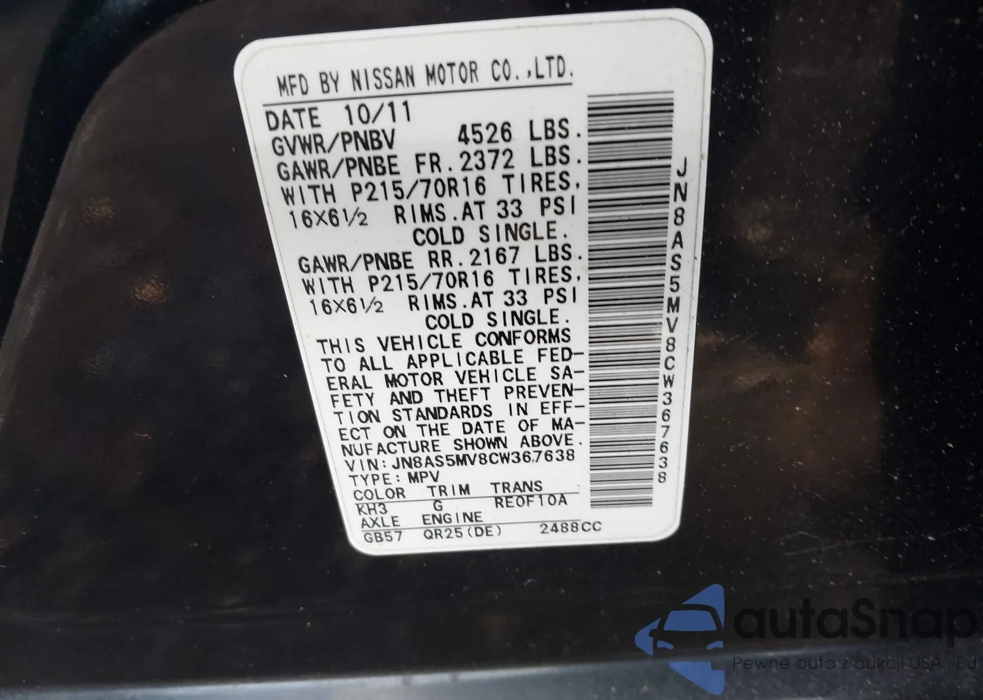 LOT: 43166938 VIN: JN8AS5MV8CW367638