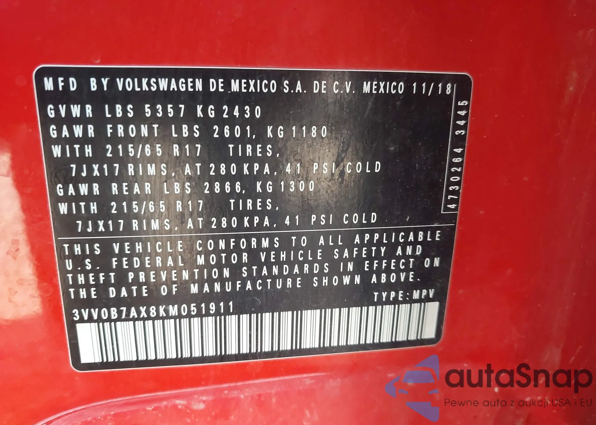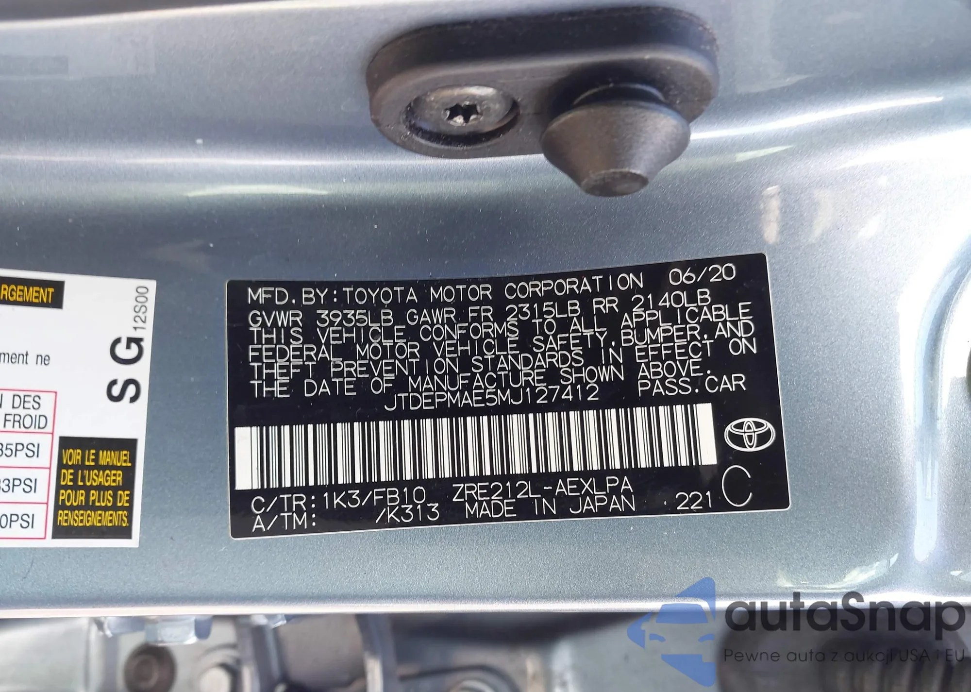 LOT: 43208752 VIN: JTDEPMAE5MJ127412