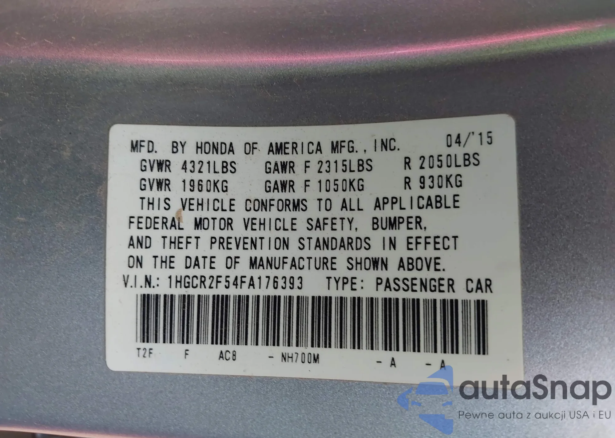 LOT: 43316202 VIN: 1HGCR2F54FA176393