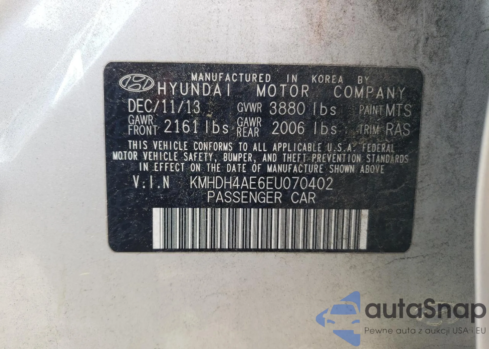 LOT: 91430835 VIN: KMHDH4AE6EU070402