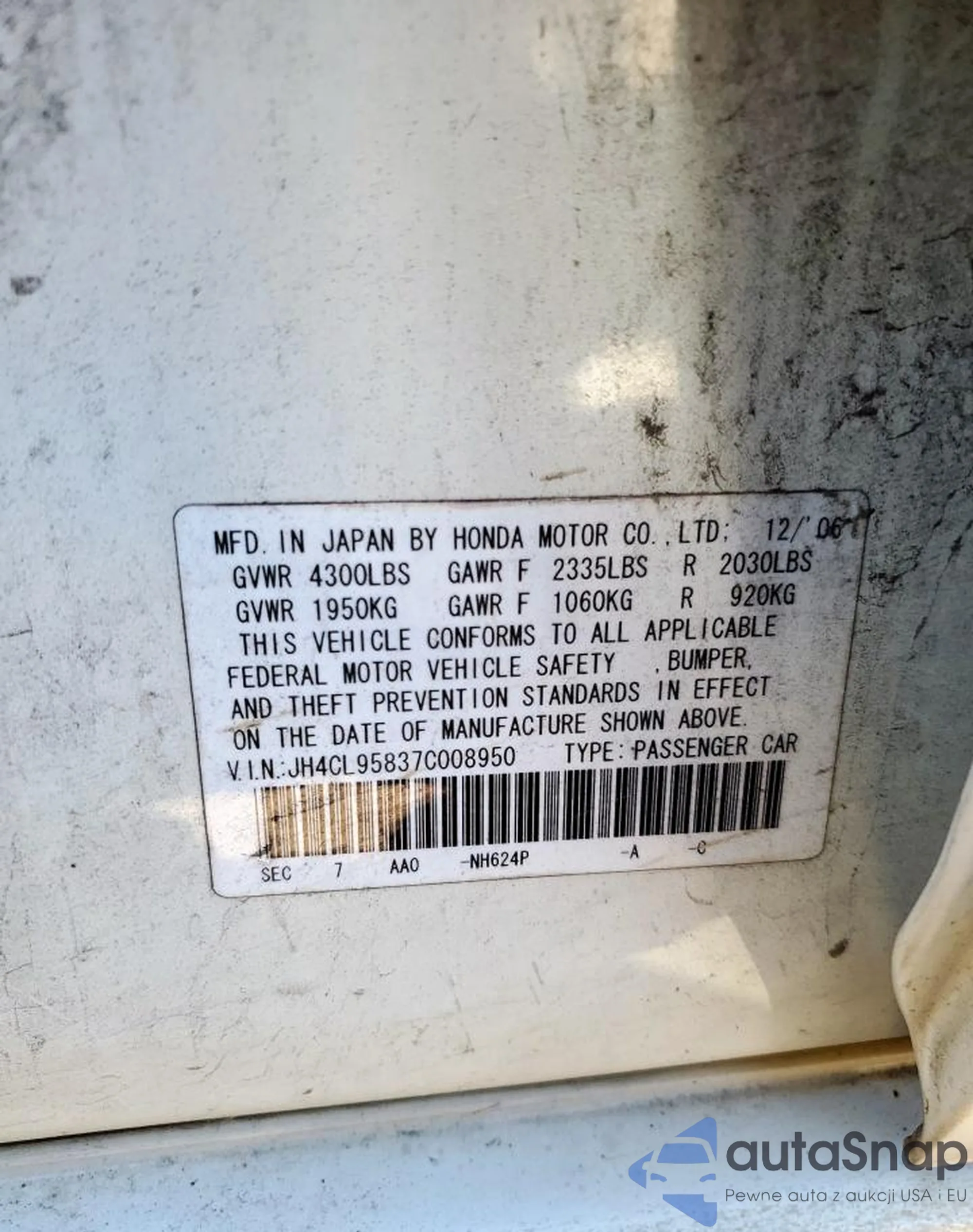 LOT: 91360625 VIN: JH4CL95837C008950