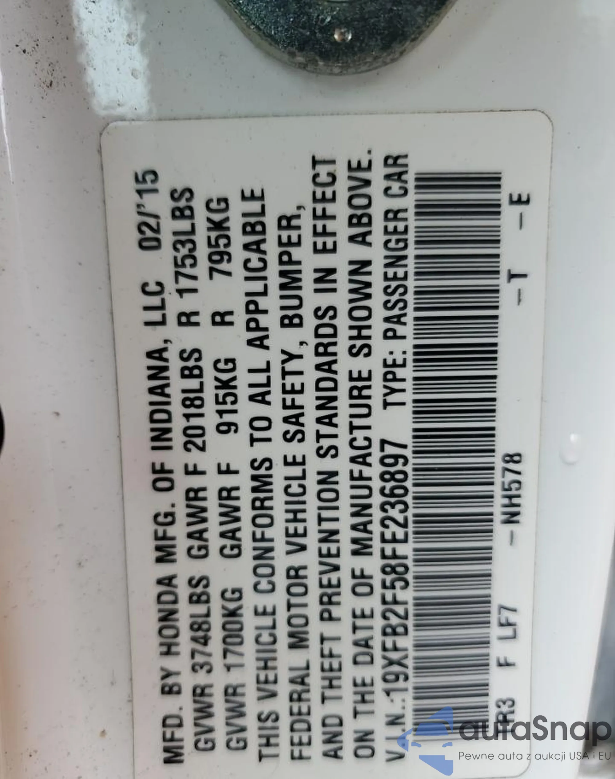 LOT: 86216805 VIN: 19XFB2F58FE236897