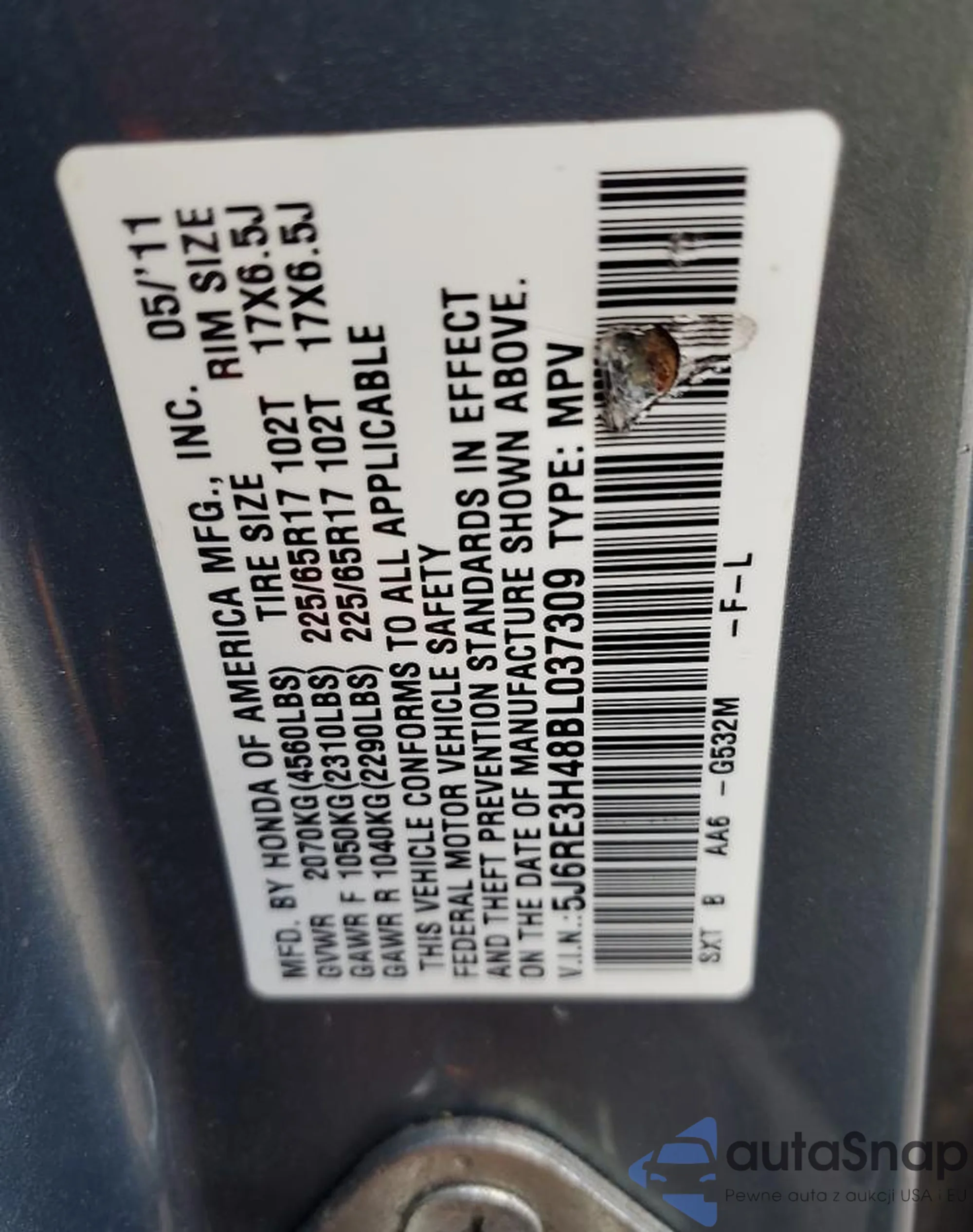 • VIN 5J6RE3H48BL037309