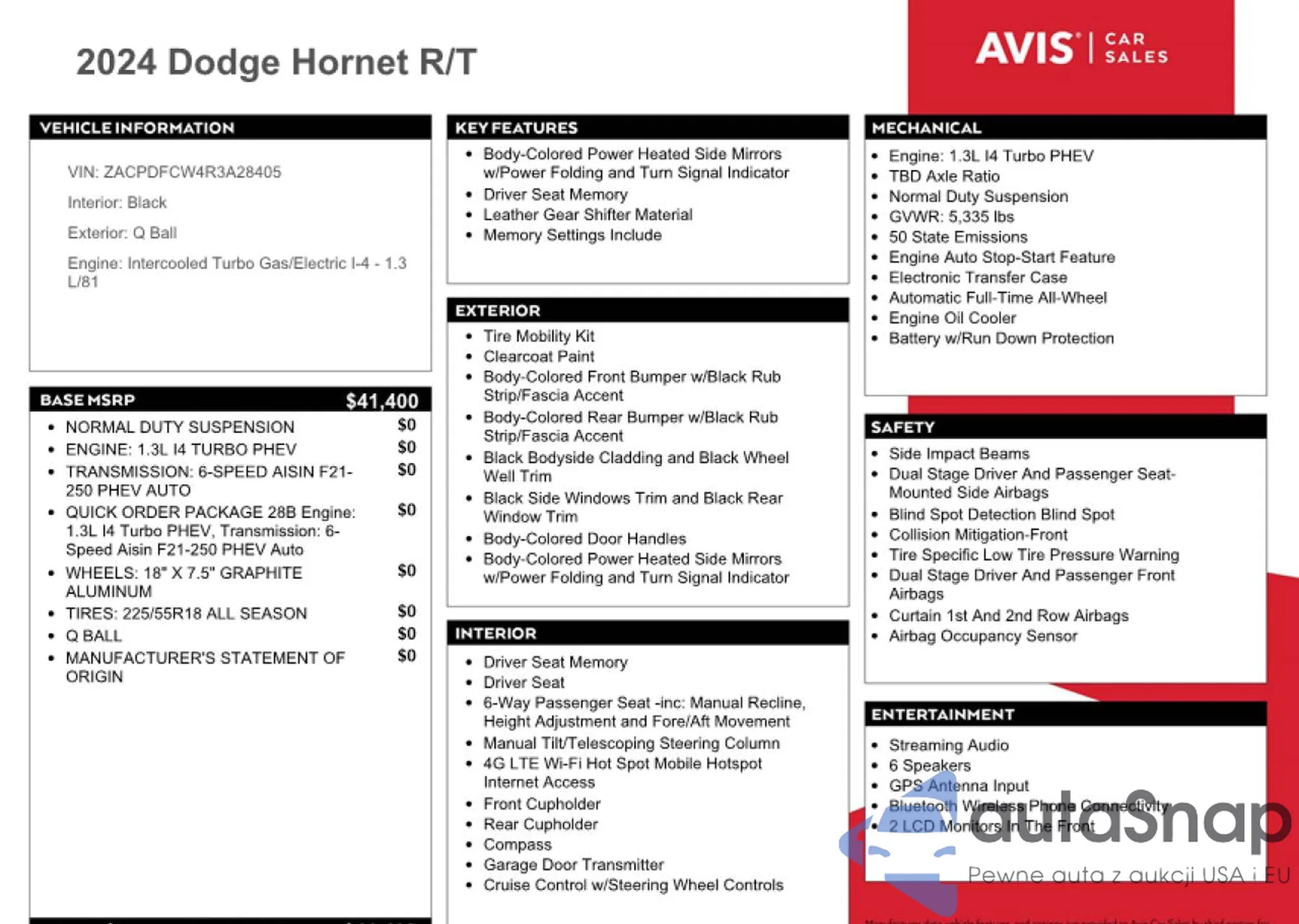 2024 Dodge Hornet R/T из США, поврежденный, VIN ZACPDFCW4R3A28405
