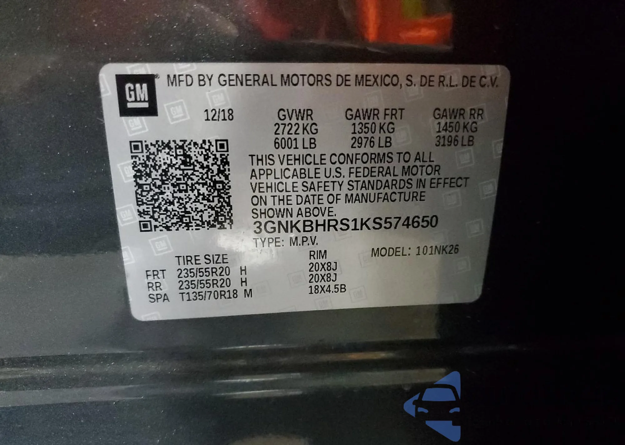 • VIN 3GNKBHRS1KS574650