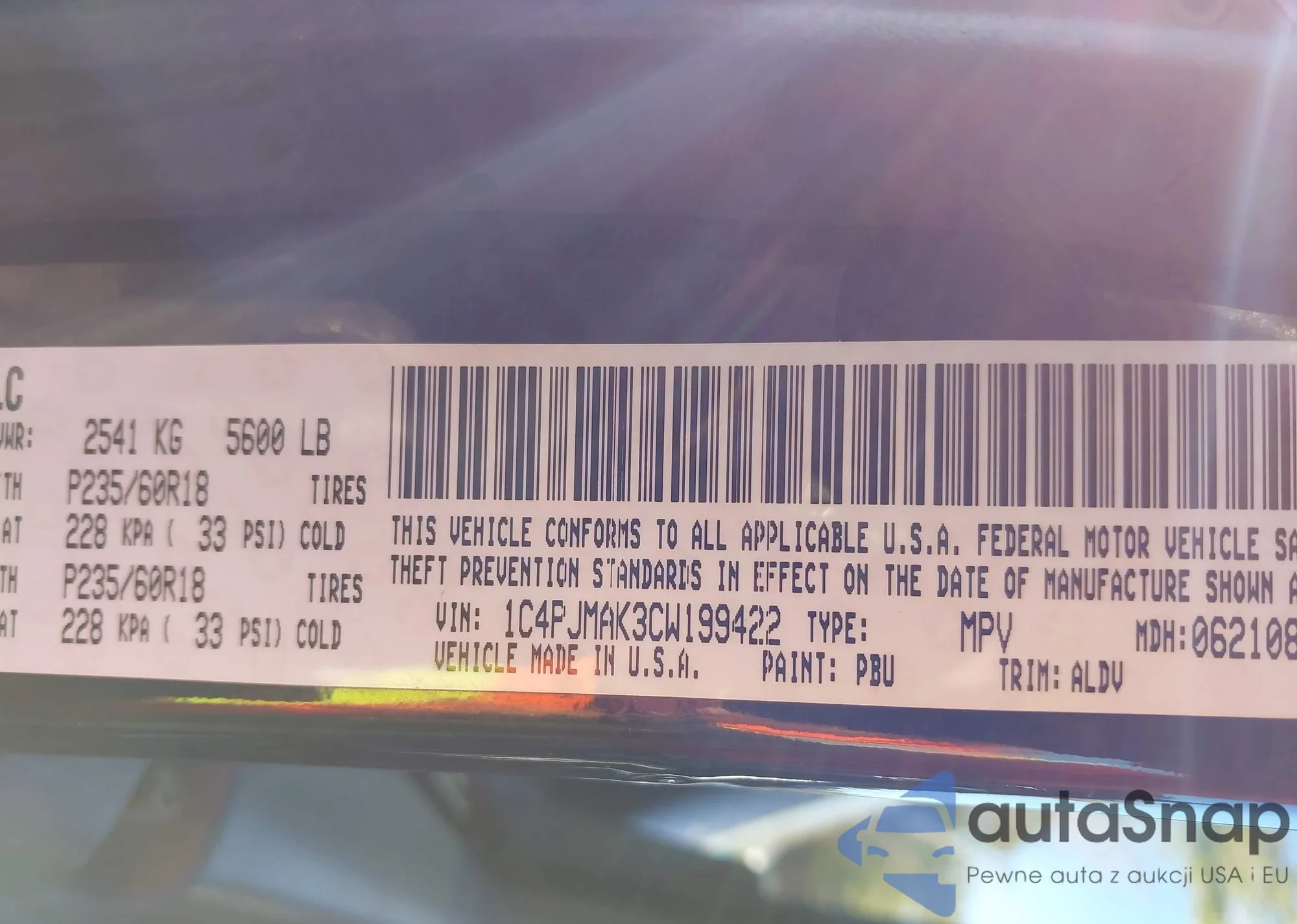 LOT: 43339737 VIN: 1C4PJMAK3CW199422