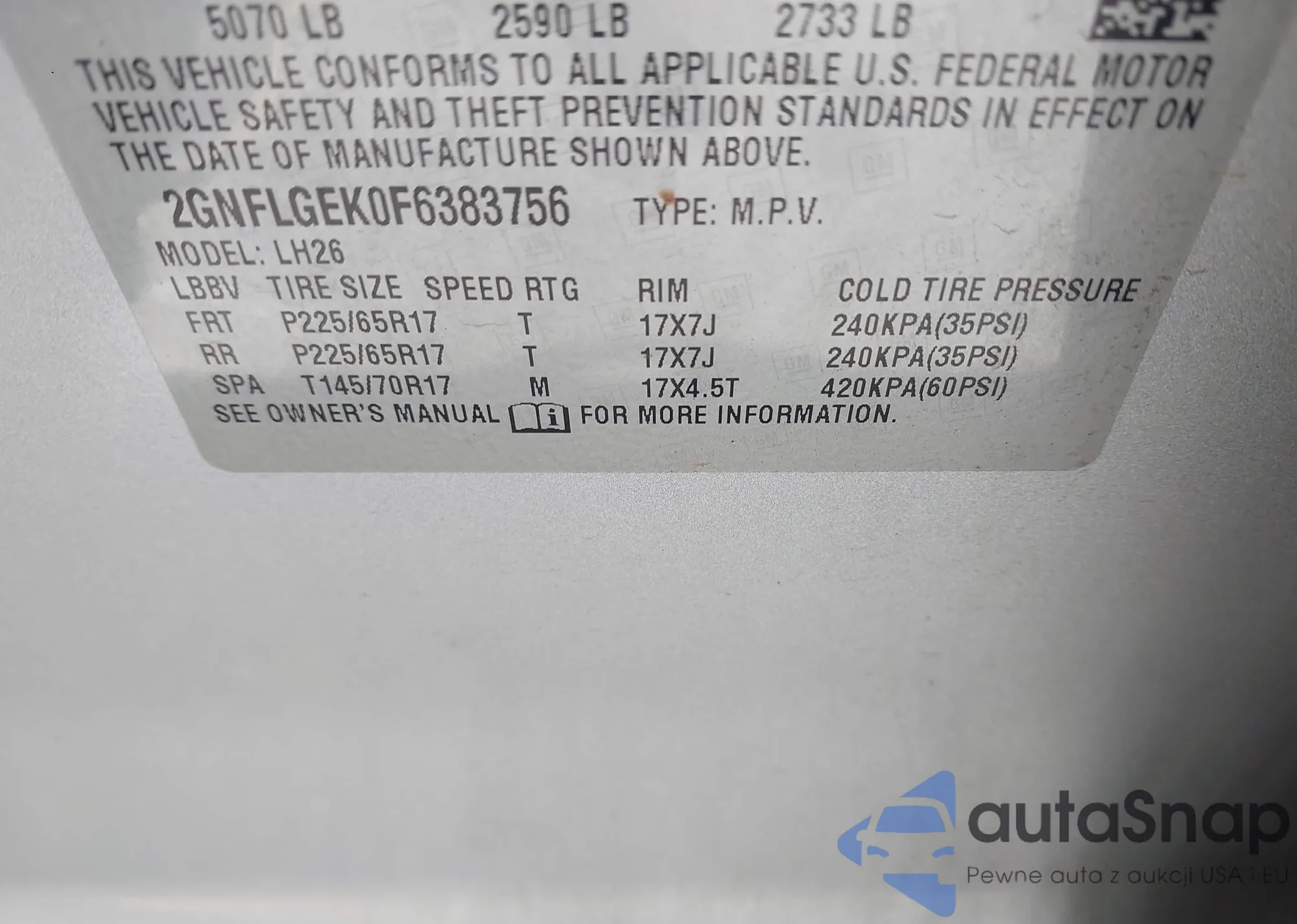 LOT: 43370609 VIN: 2GNFLGEK0F6383756