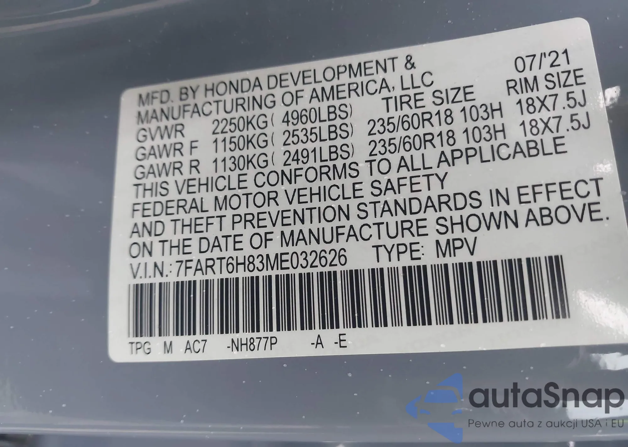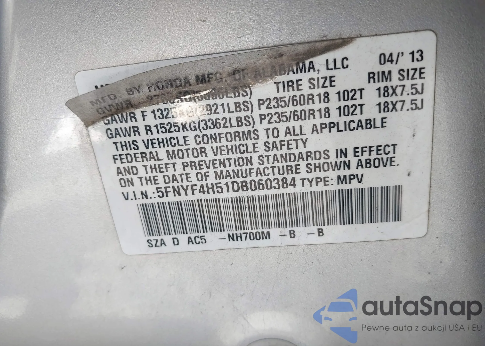 • VIN 5FNYF4H51DB060384