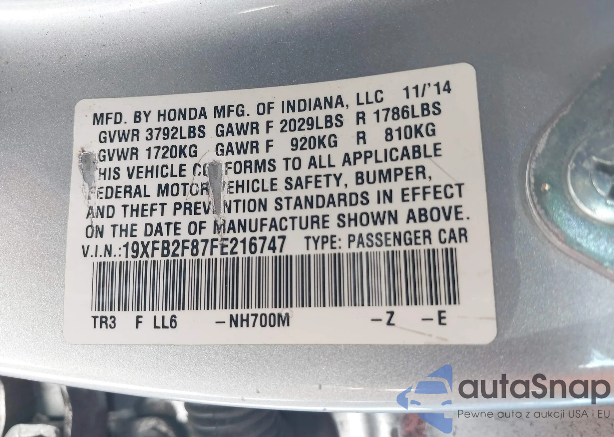 LOT: 43426355 VIN: 19XFA1F8XAE056112