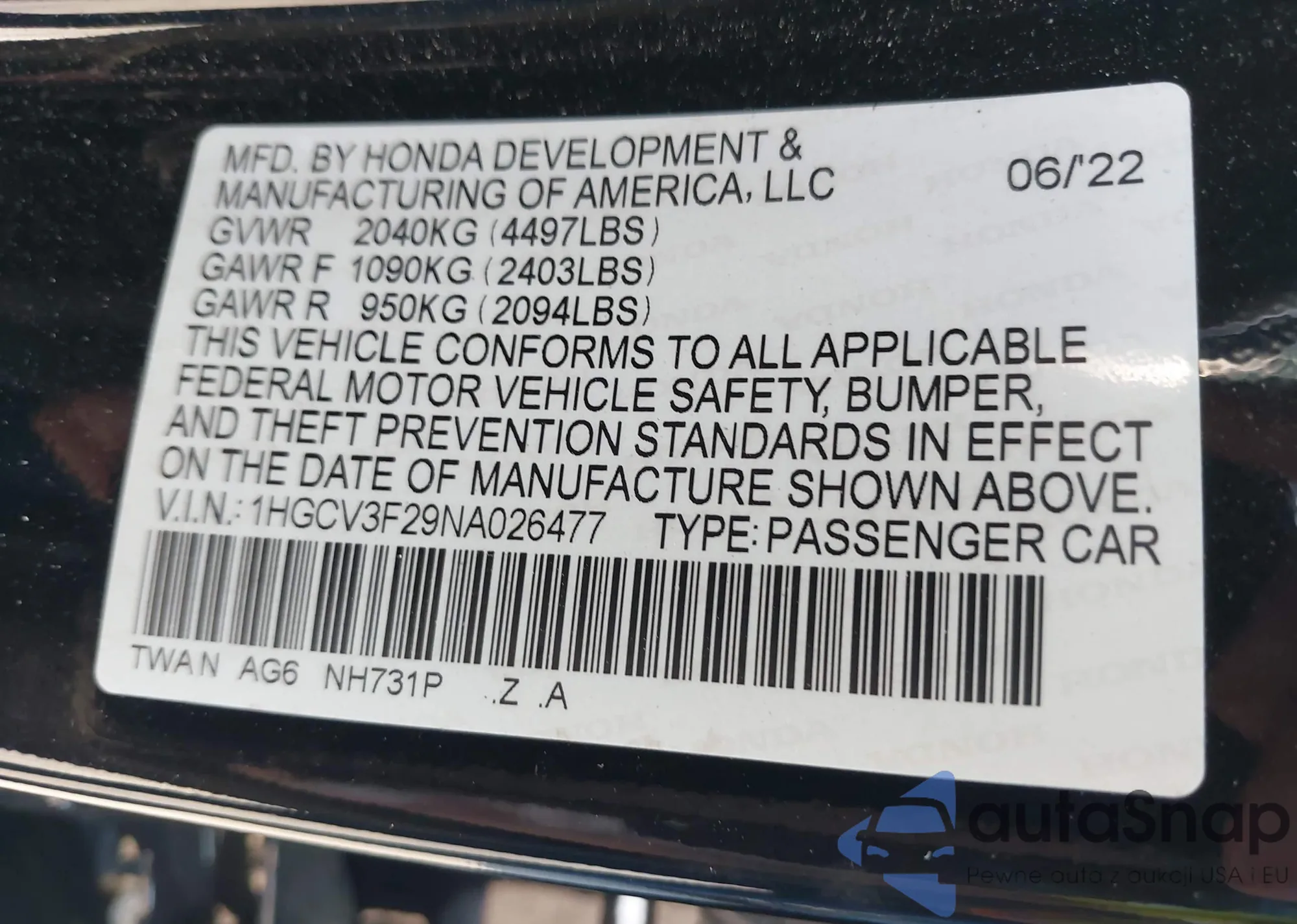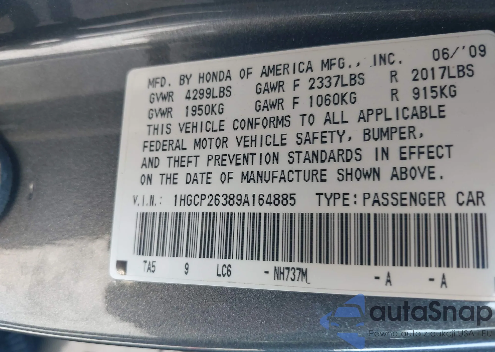LOT: 43413545 VIN: 1HGCP26389A164885