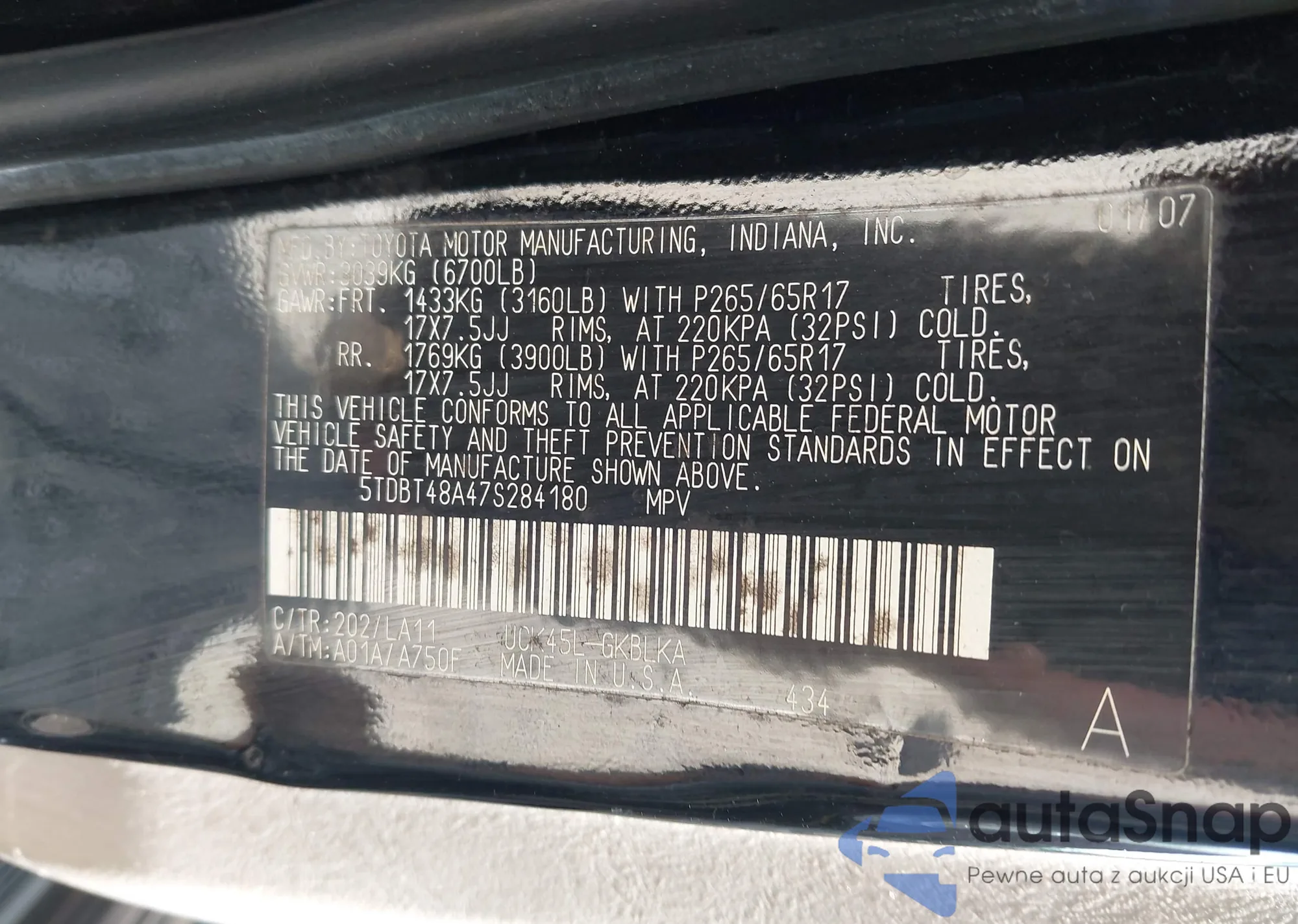 • VIN 5TDBT48A47S284180