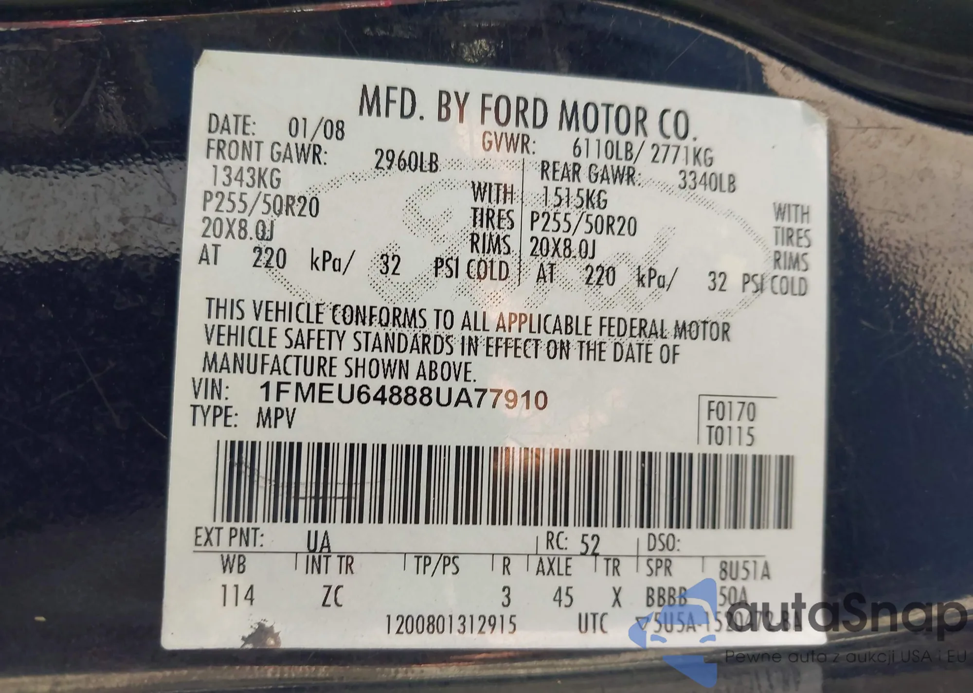 • VIN 1FMEU64888UA77910