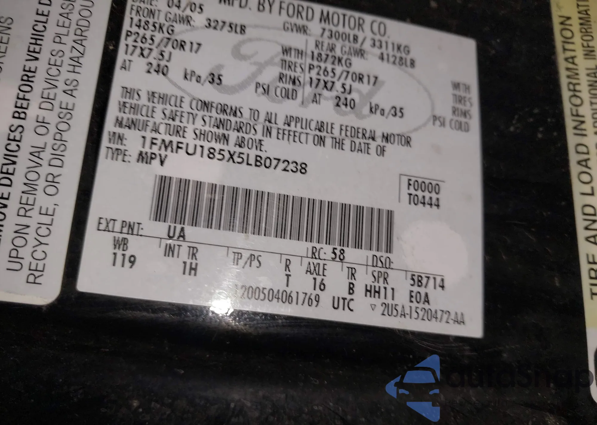 LOT: 43128020 VIN: 1FMFU185X5LB07238