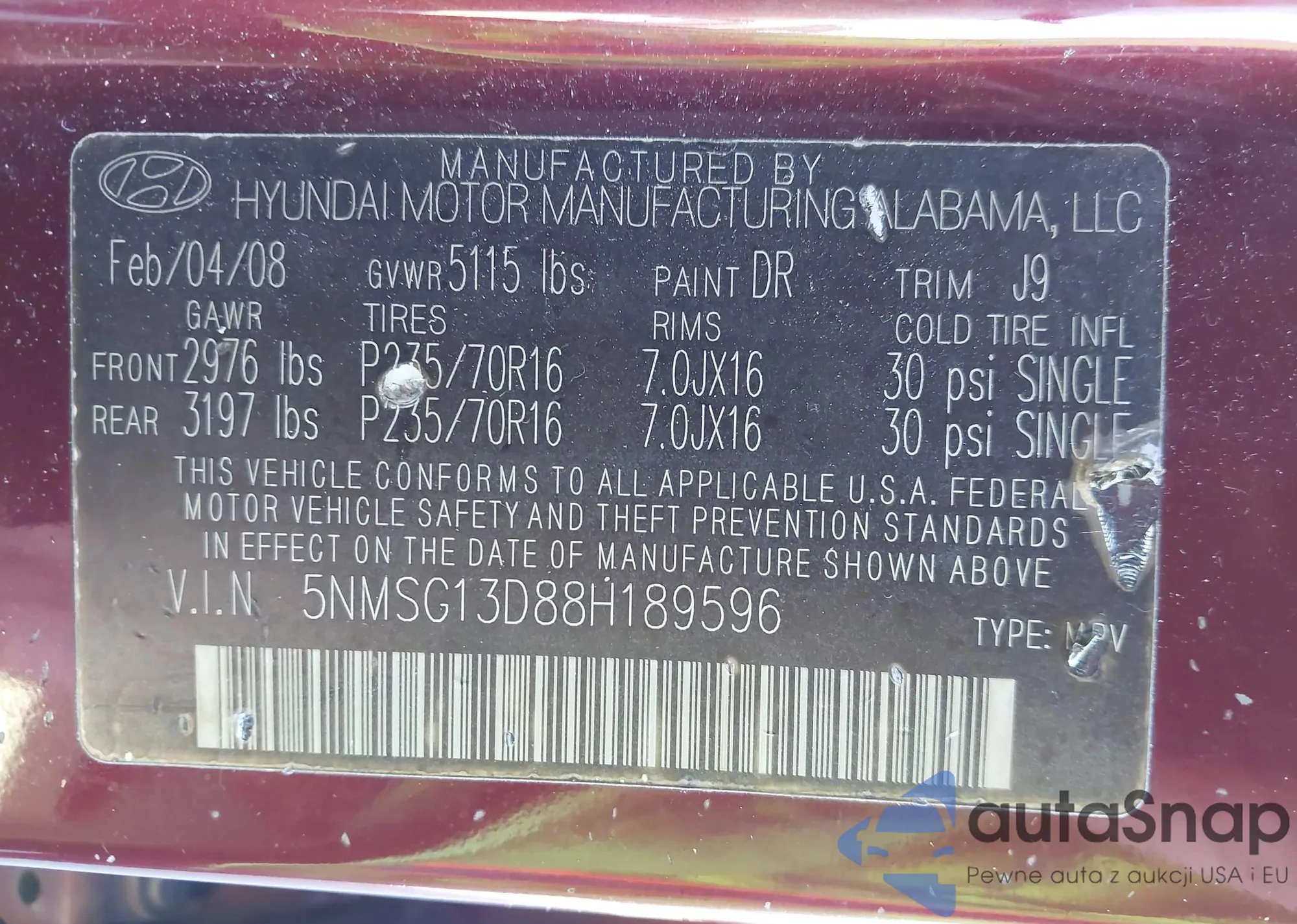 LOT: 43303755 VIN: 5NMSG13D88H189596