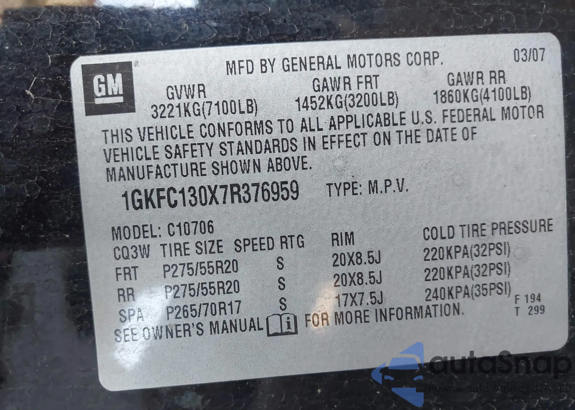LOT: 43359562 VIN: 1GKFC130X7R376959