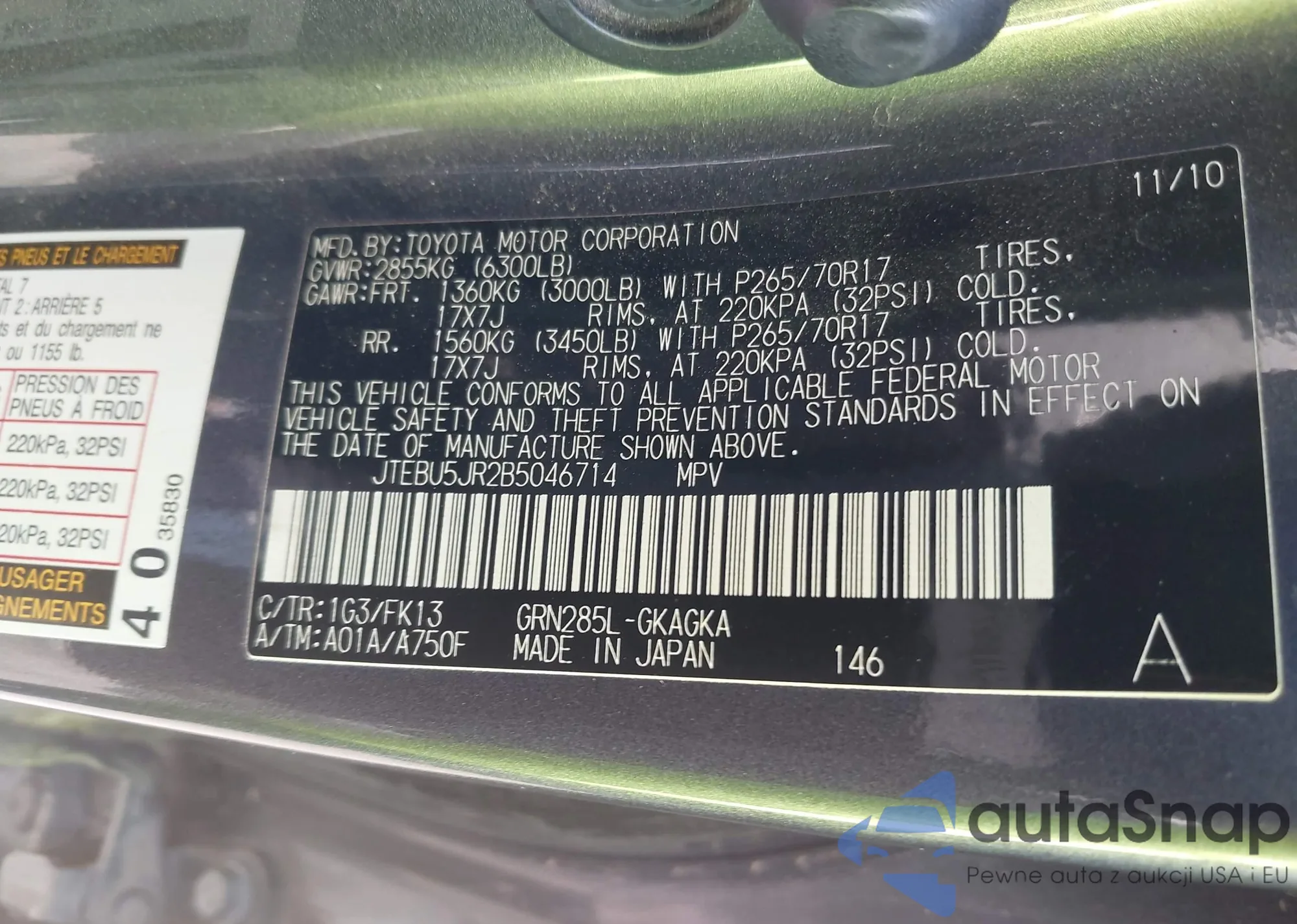 LOT: 43302064 VIN: JTEBU5JR2B5046714