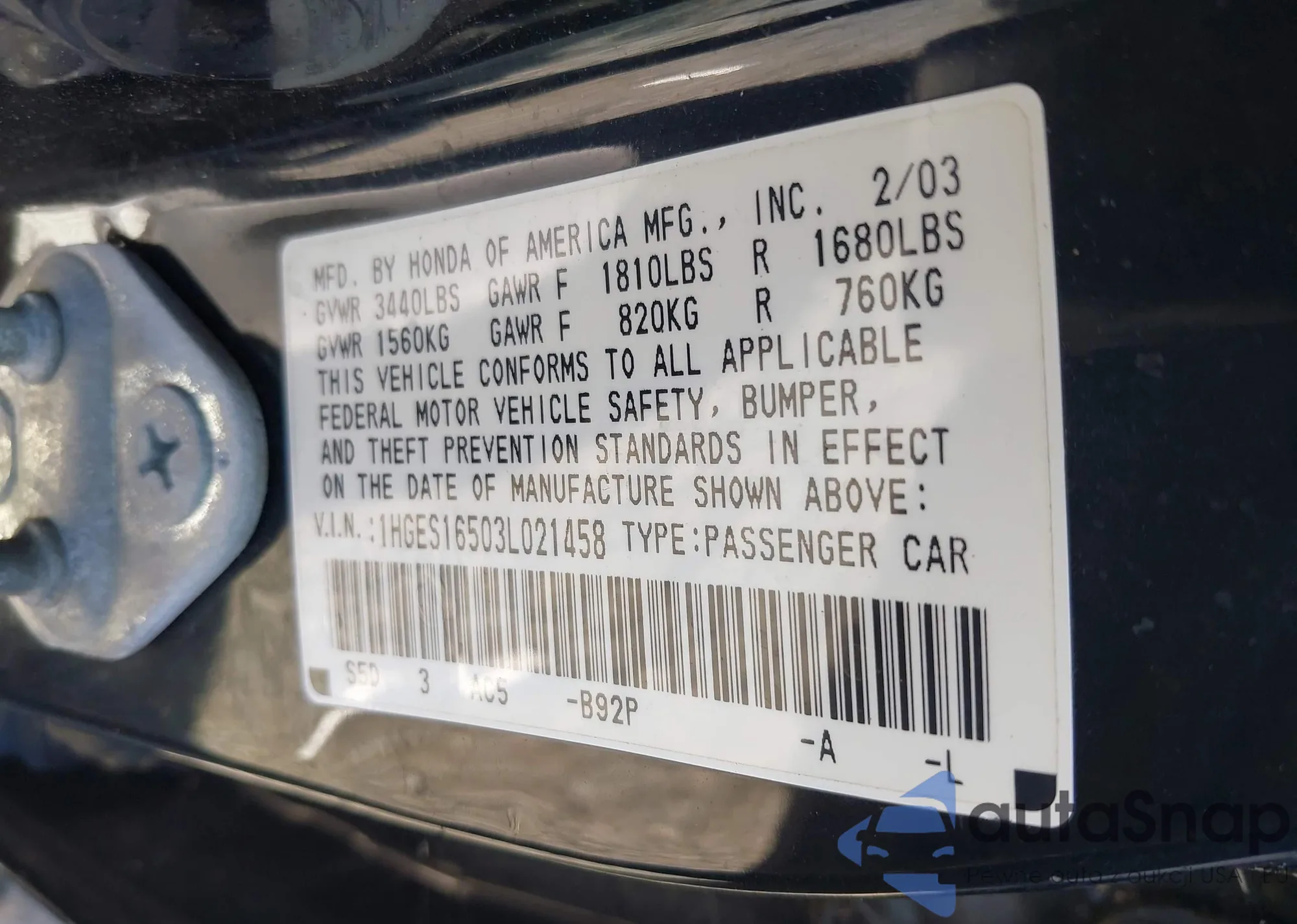 • VIN 1HGES16503L021458