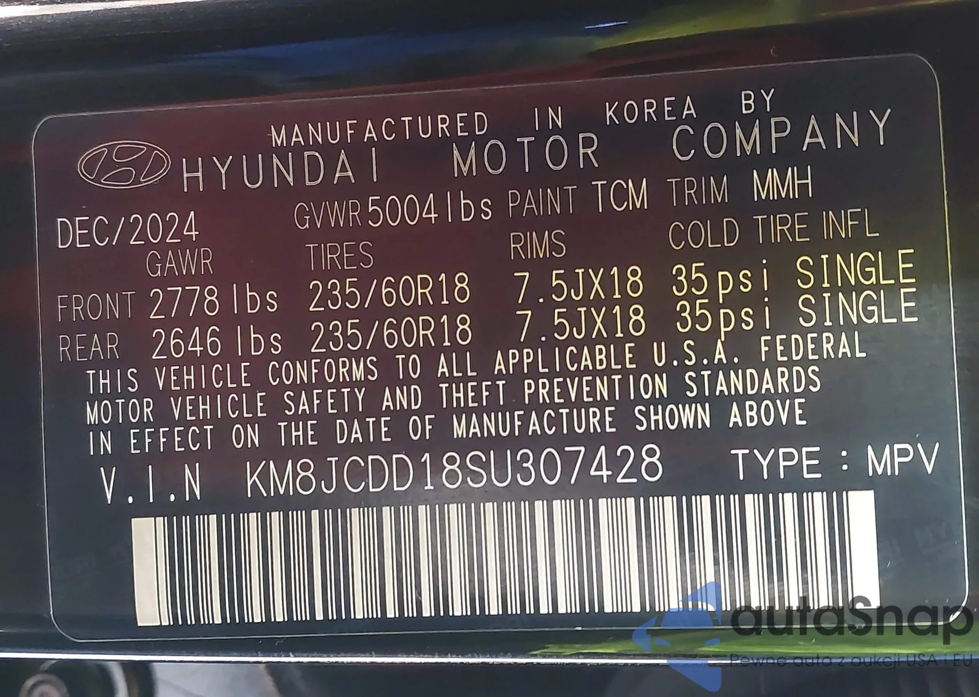 • VIN KM8JCDD18SU307428