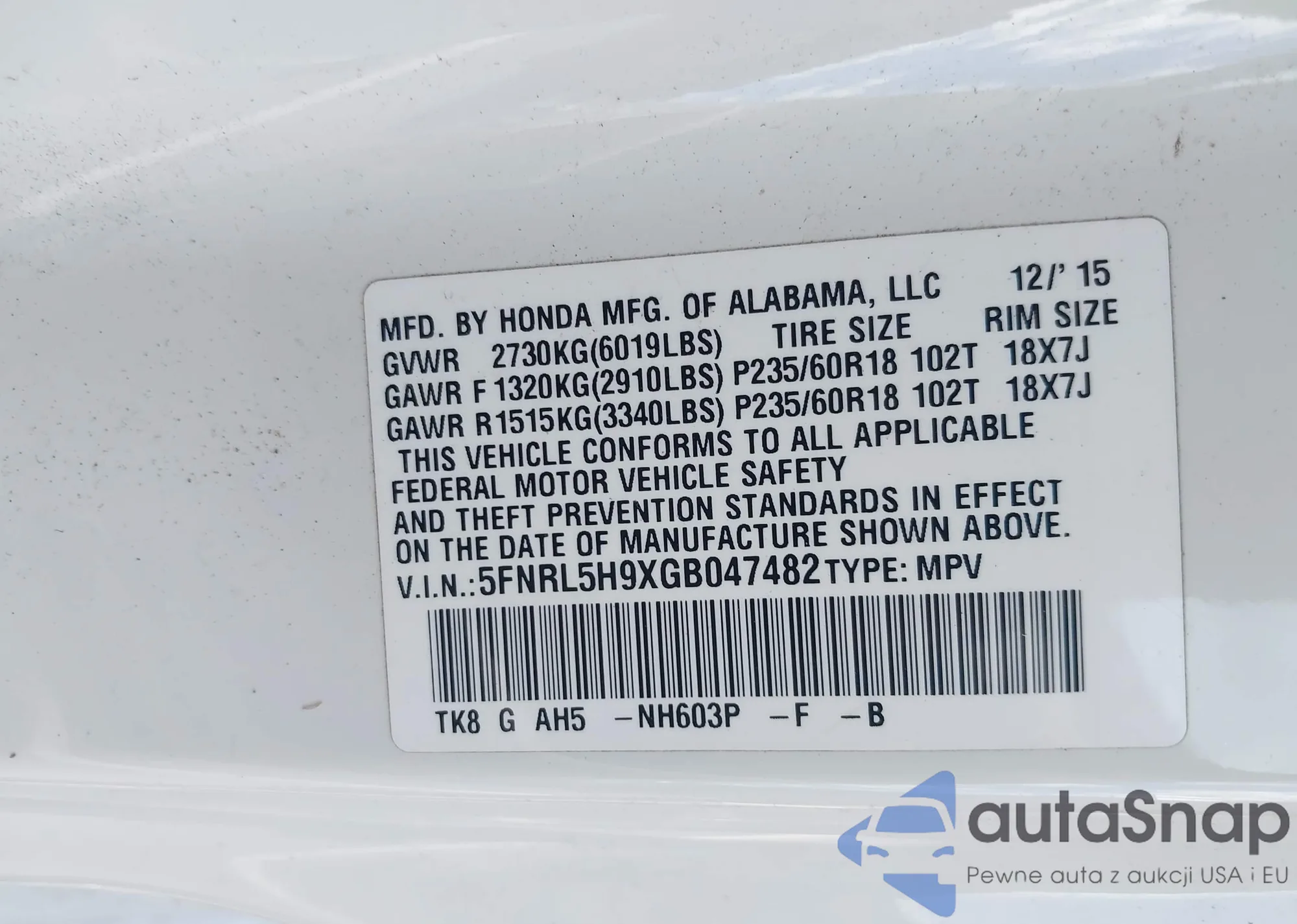 • VIN 5FNRL5H66BB059207