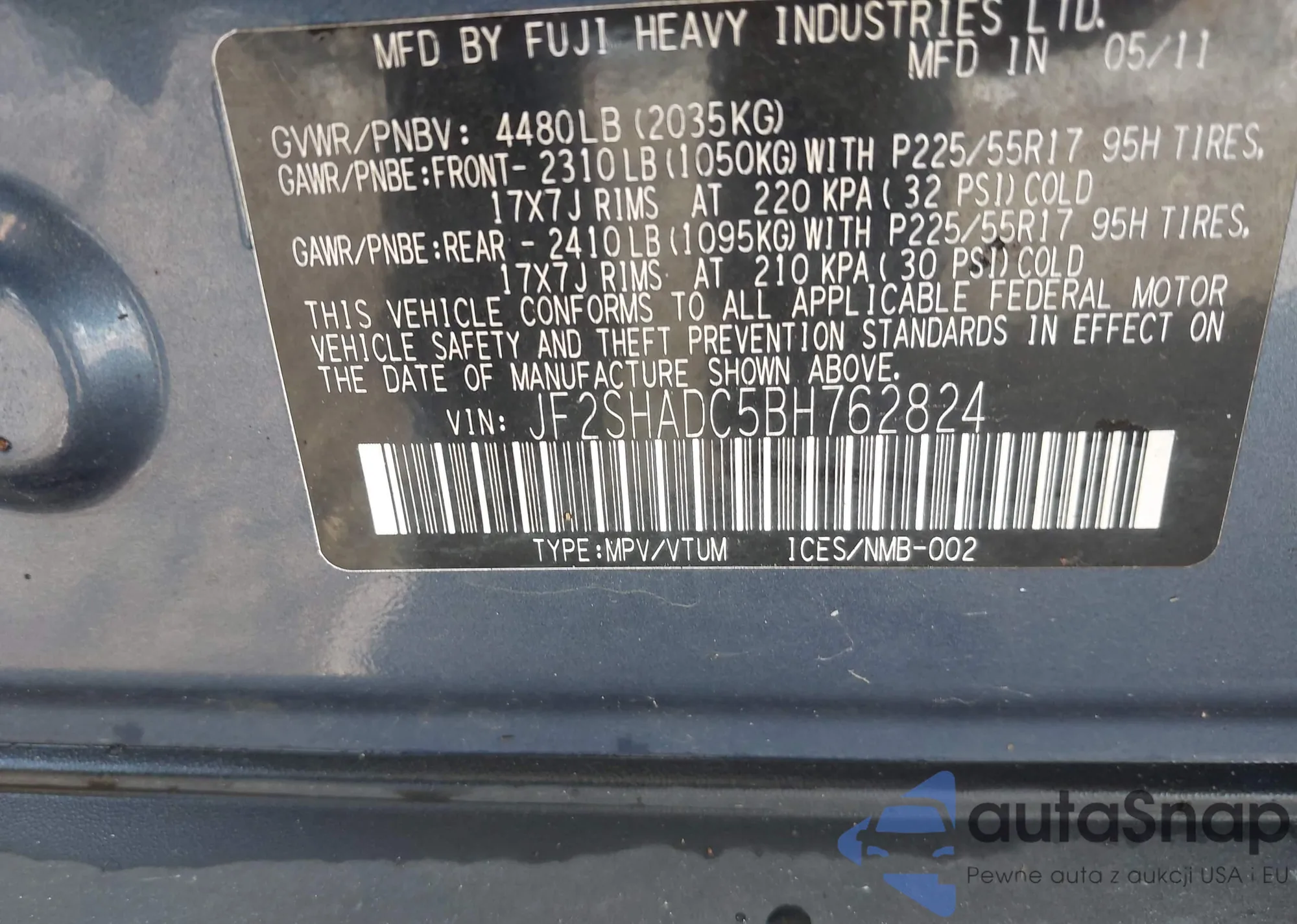 LOT: 43343669 VIN: JF2SHADC5BH762824