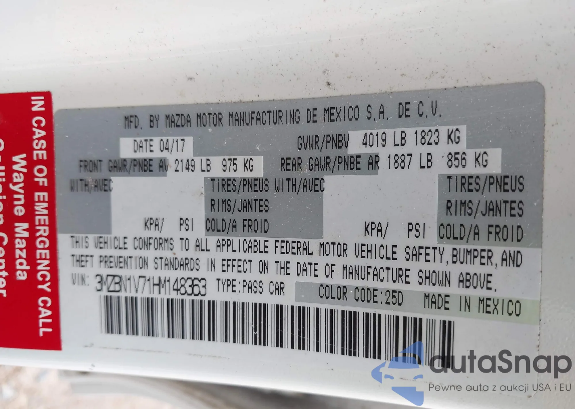 LOT: 43350157 VIN: 3MZBN1V71HM148363