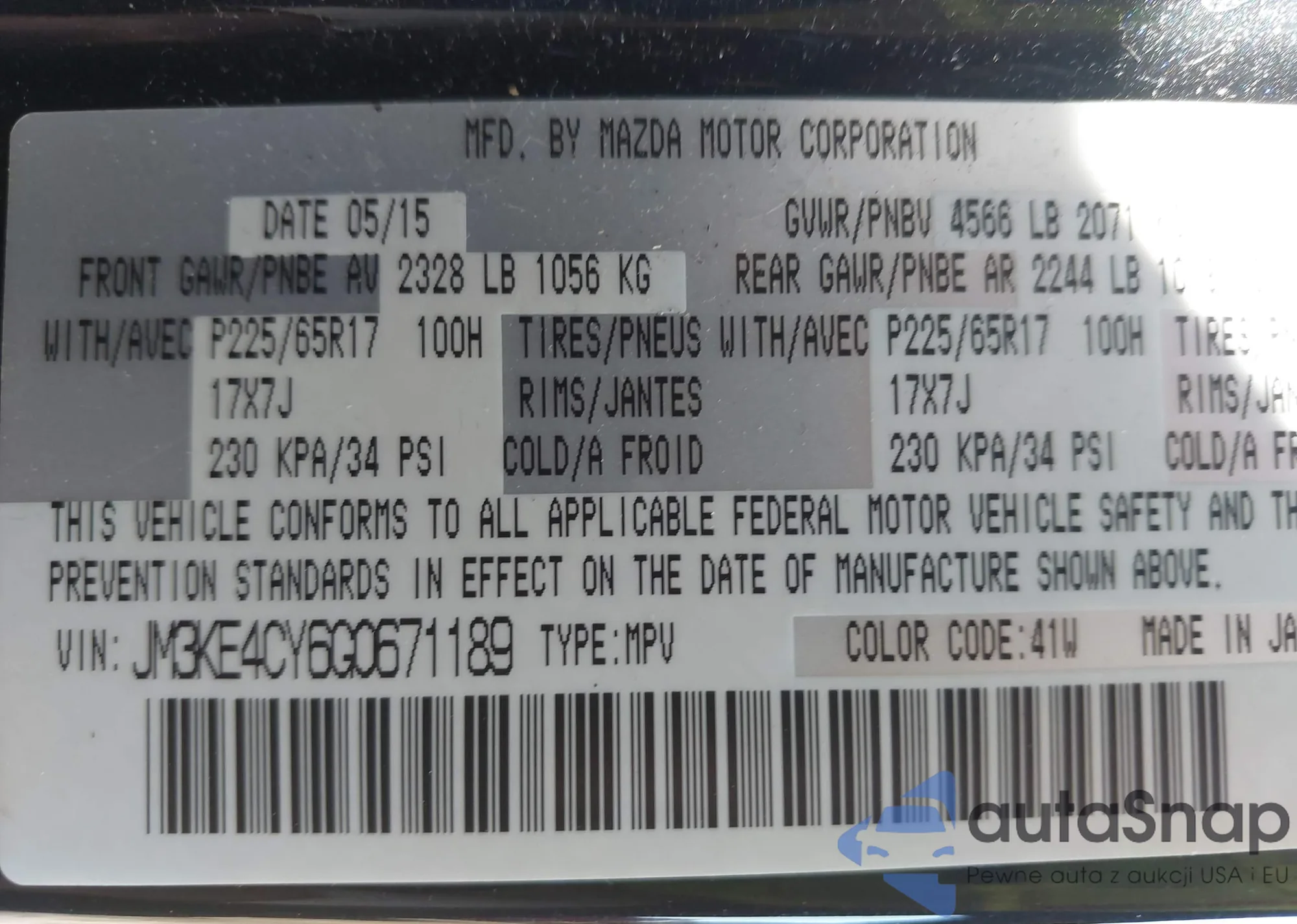 LOT: 43350538 VIN: JM3KE4CY6G0671189