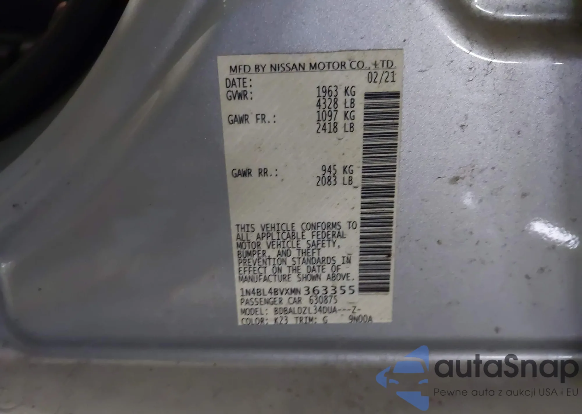 • VIN 1N4BL4BVXMN363355
