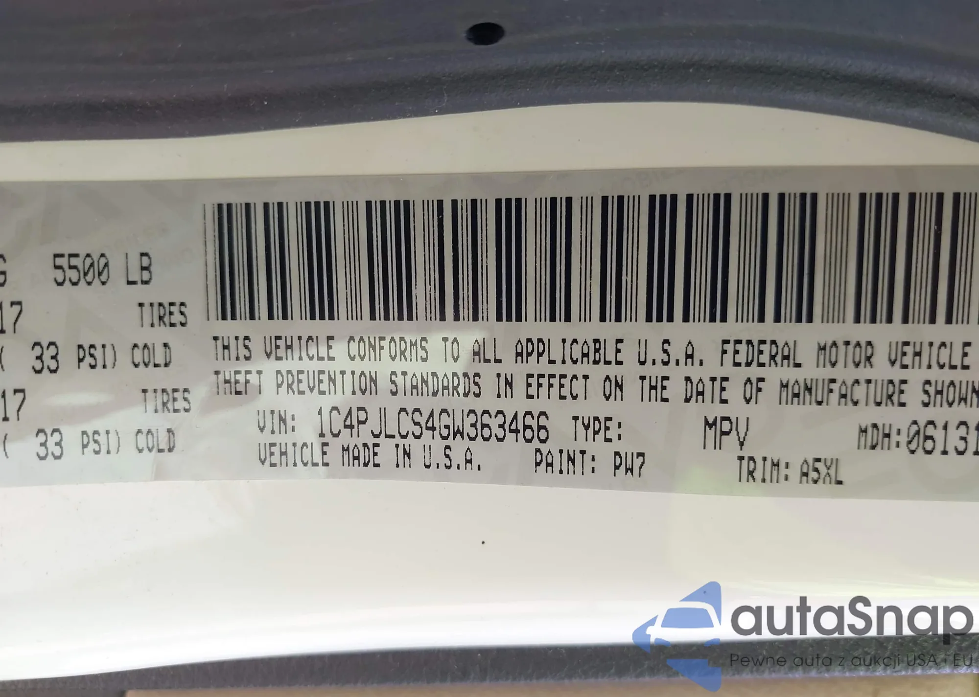 LOT: 42736187 VIN: 1C4PJLCS4GW363466
