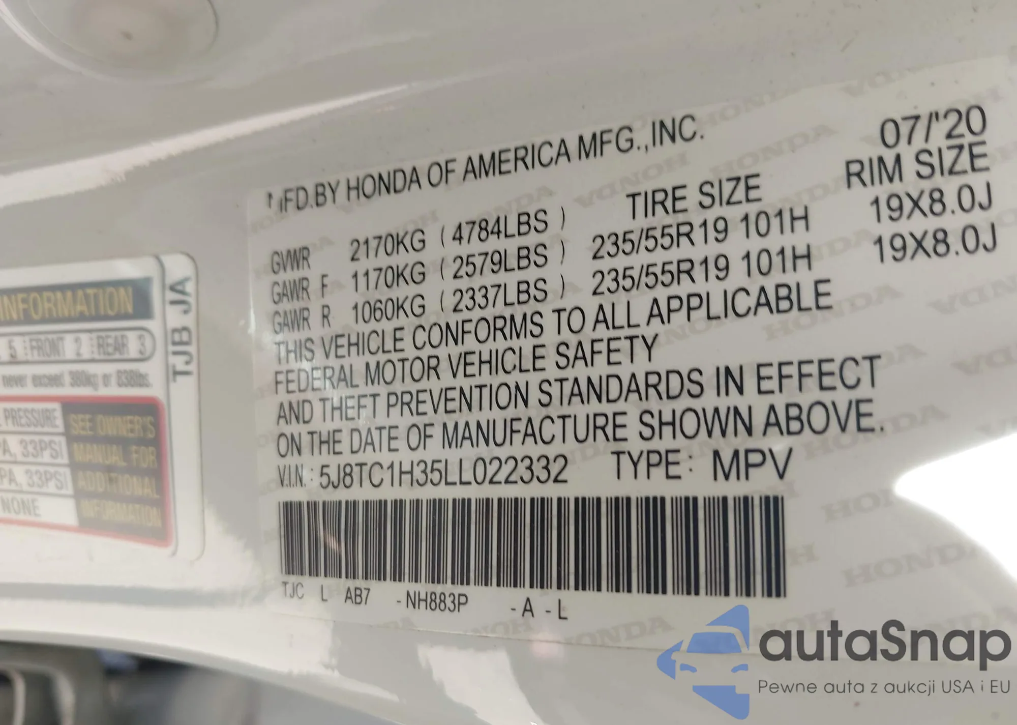 LOT: 42877922 VIN: 5J8TC1H35LL022332
