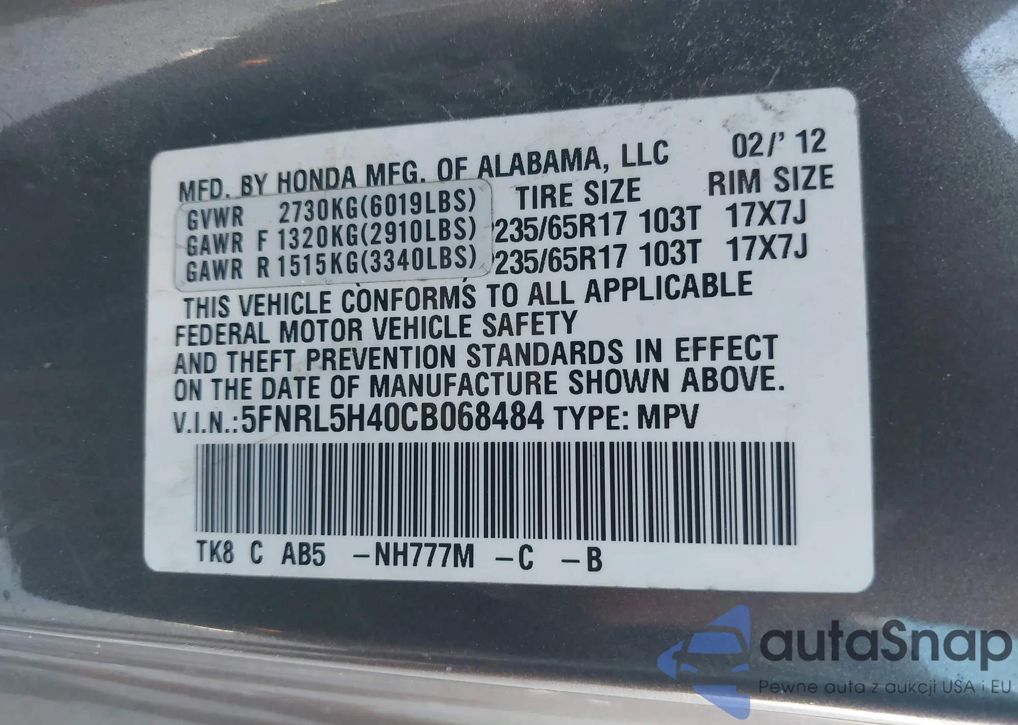 • VIN 5FNRL5H40CB068484