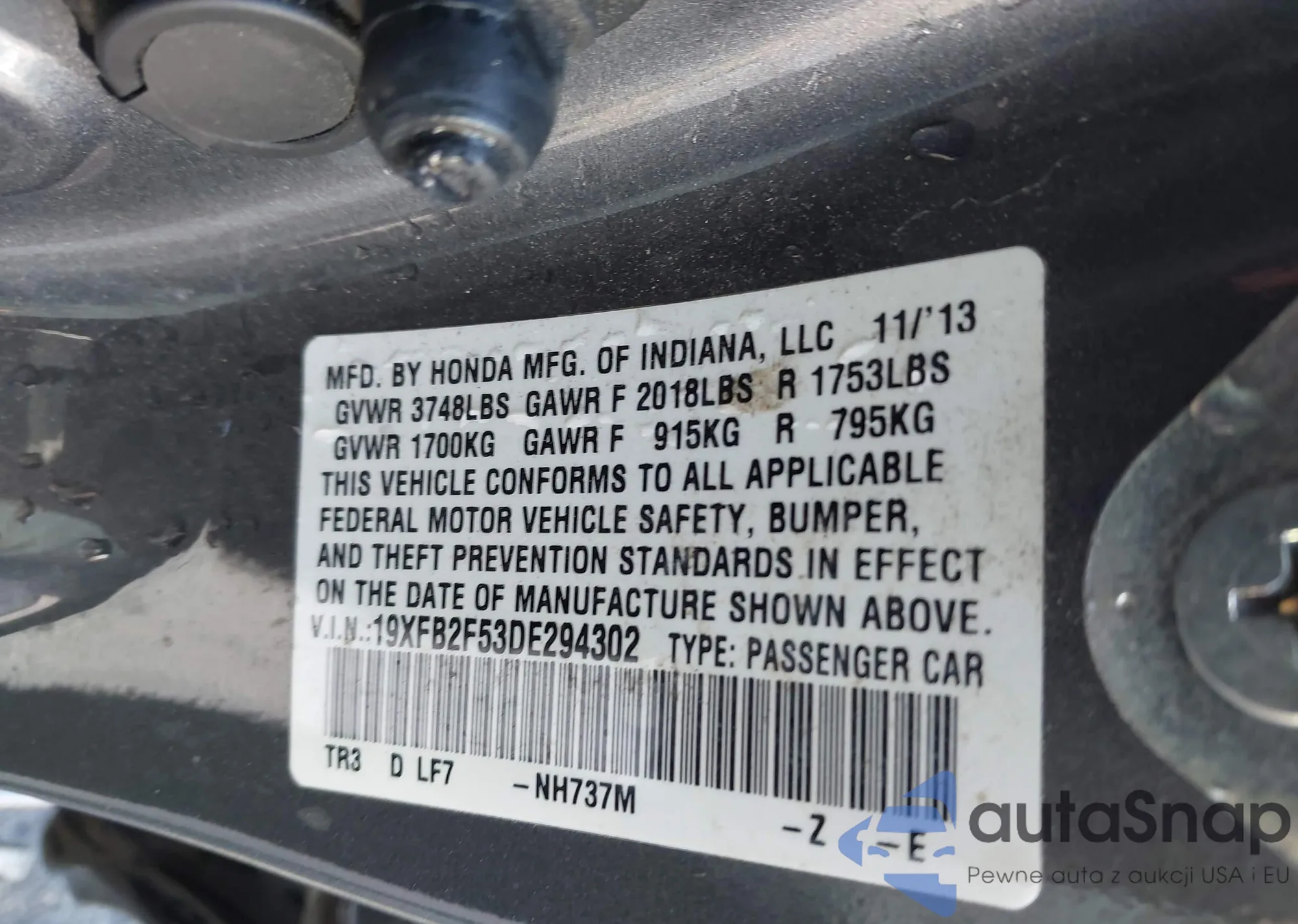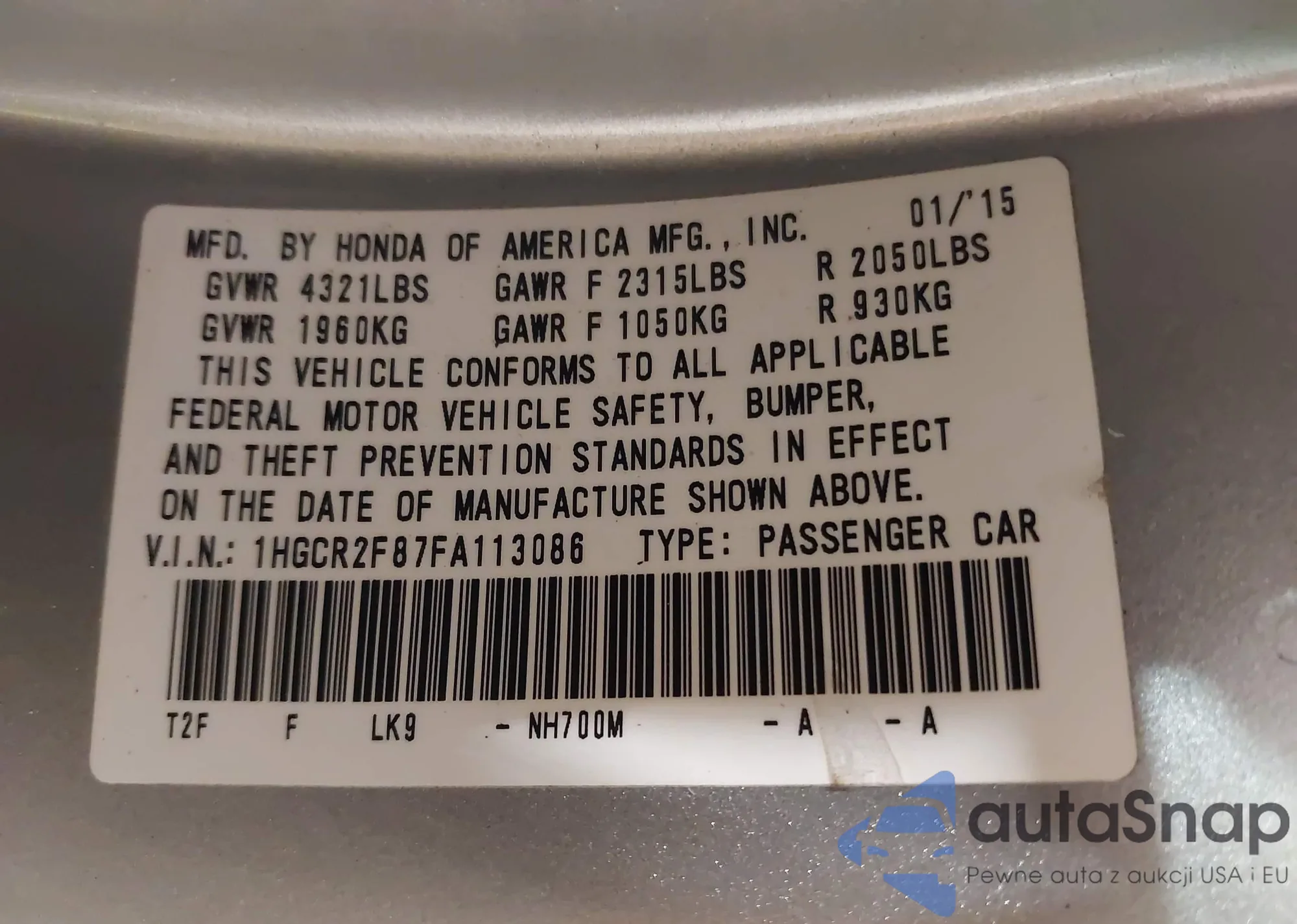 LOT: 43119954 VIN: 1HGCR2F87FA113086