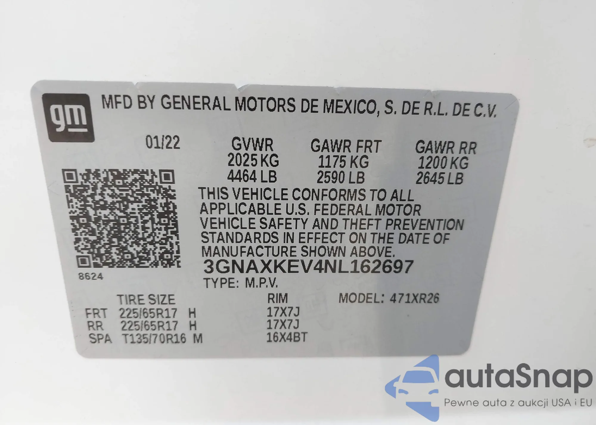 • VIN 3GNAXKEV4NL162697