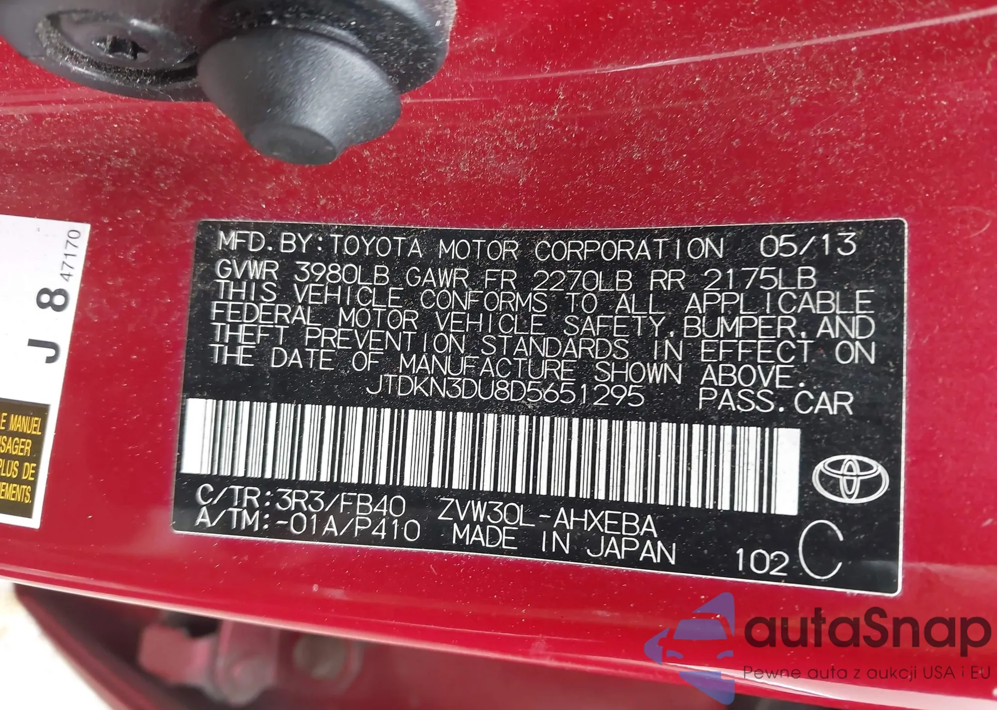 LOT: 43392972 VIN: JTDKN3DU8D5651295