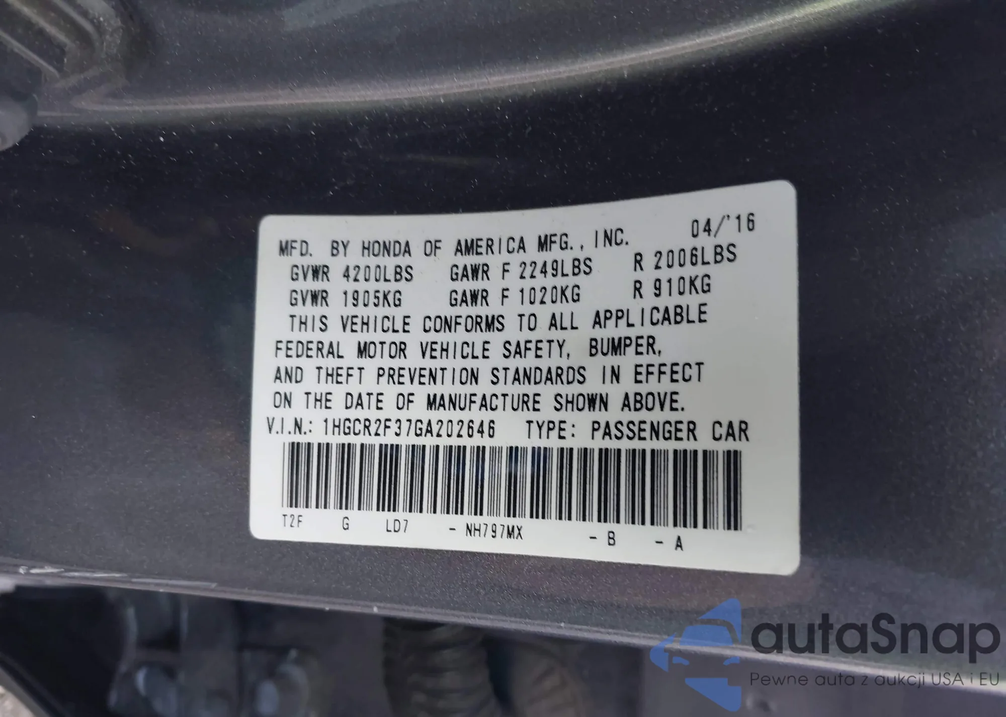• VIN 1HGCR2F37GA202646