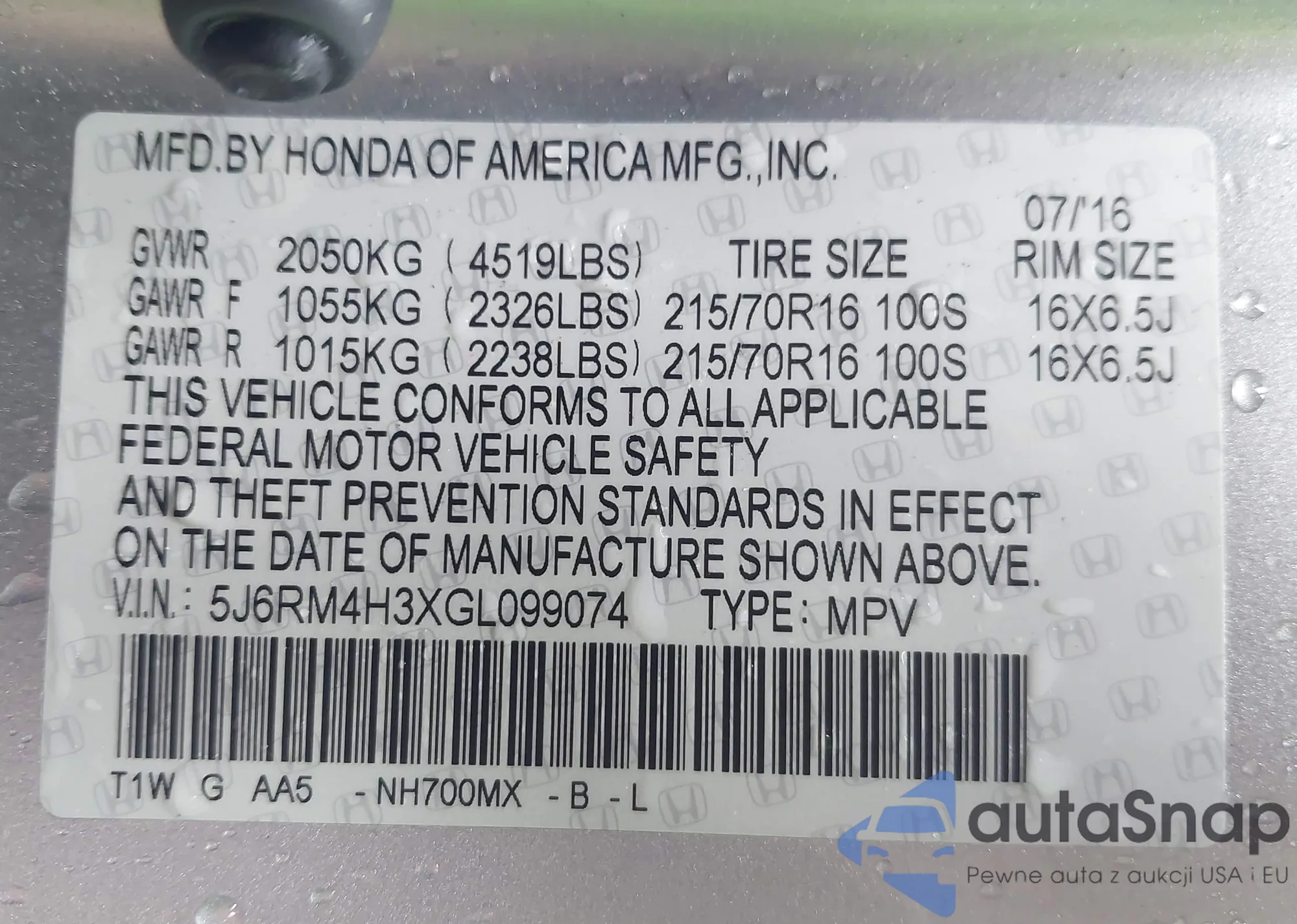 • VIN 5J6RM4H3XGL099074