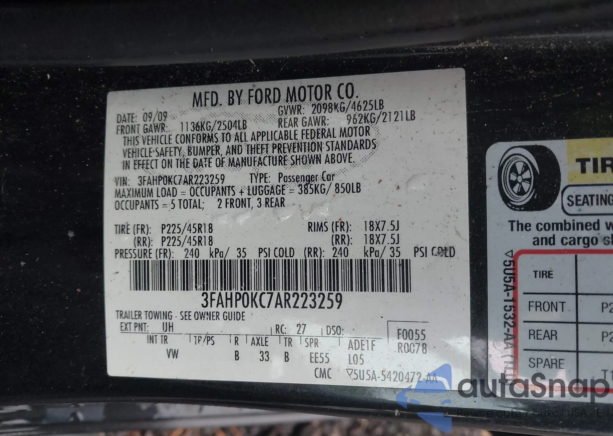 • VIN 3FAHP0KC7AR223259