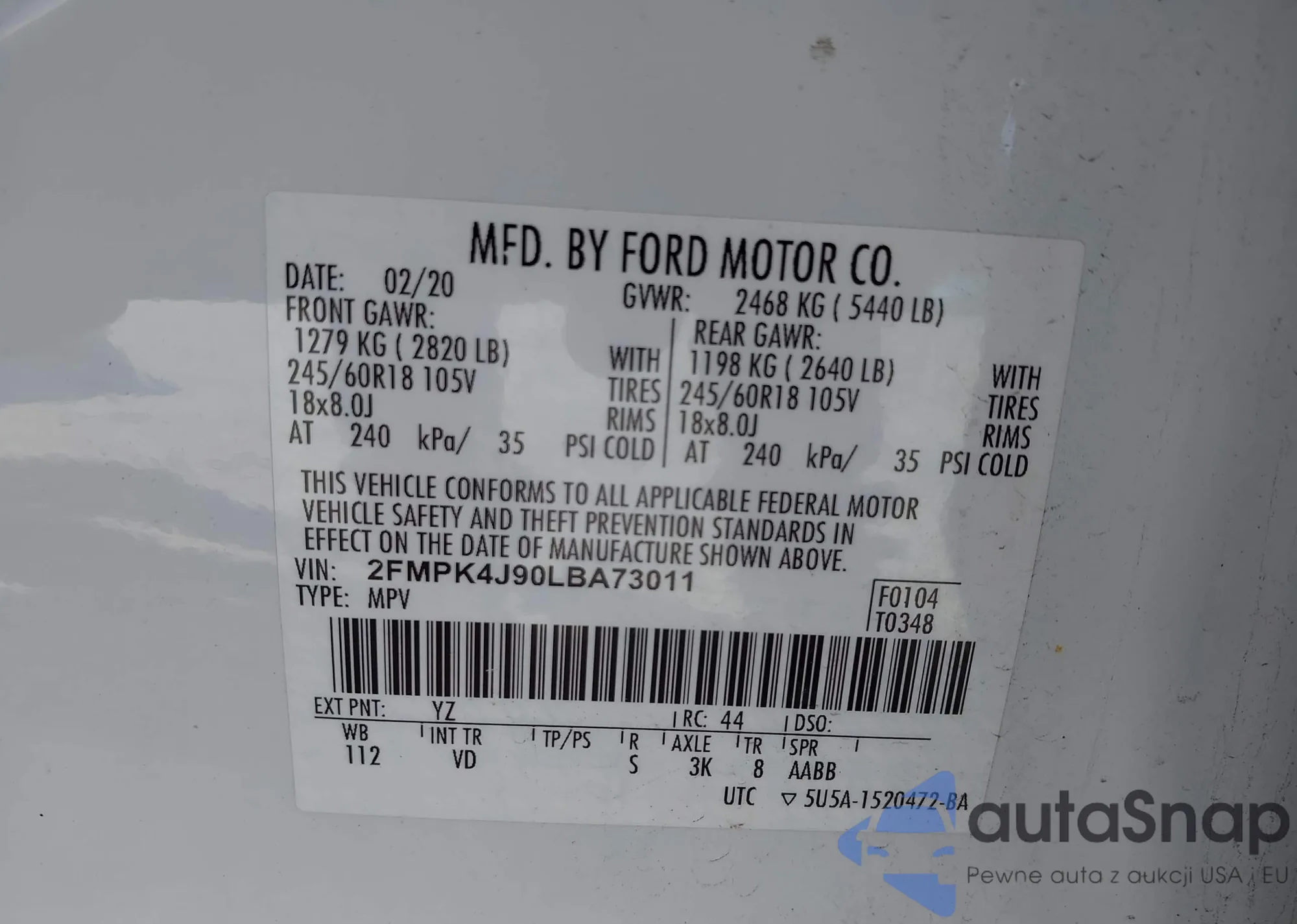 LOT: 43353698 VIN: 2FMPK4J90LBA73011
