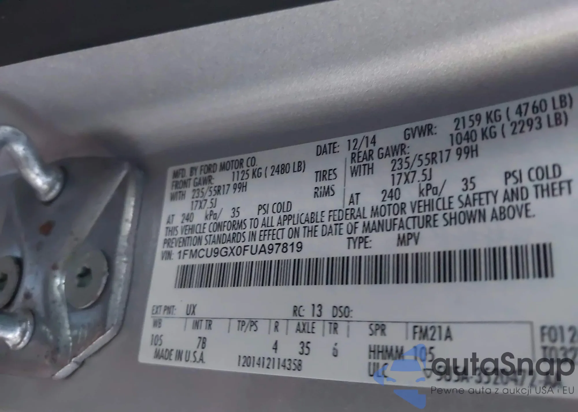 LOT: 43389770 VIN: 1FMCU9GX0FUA97819