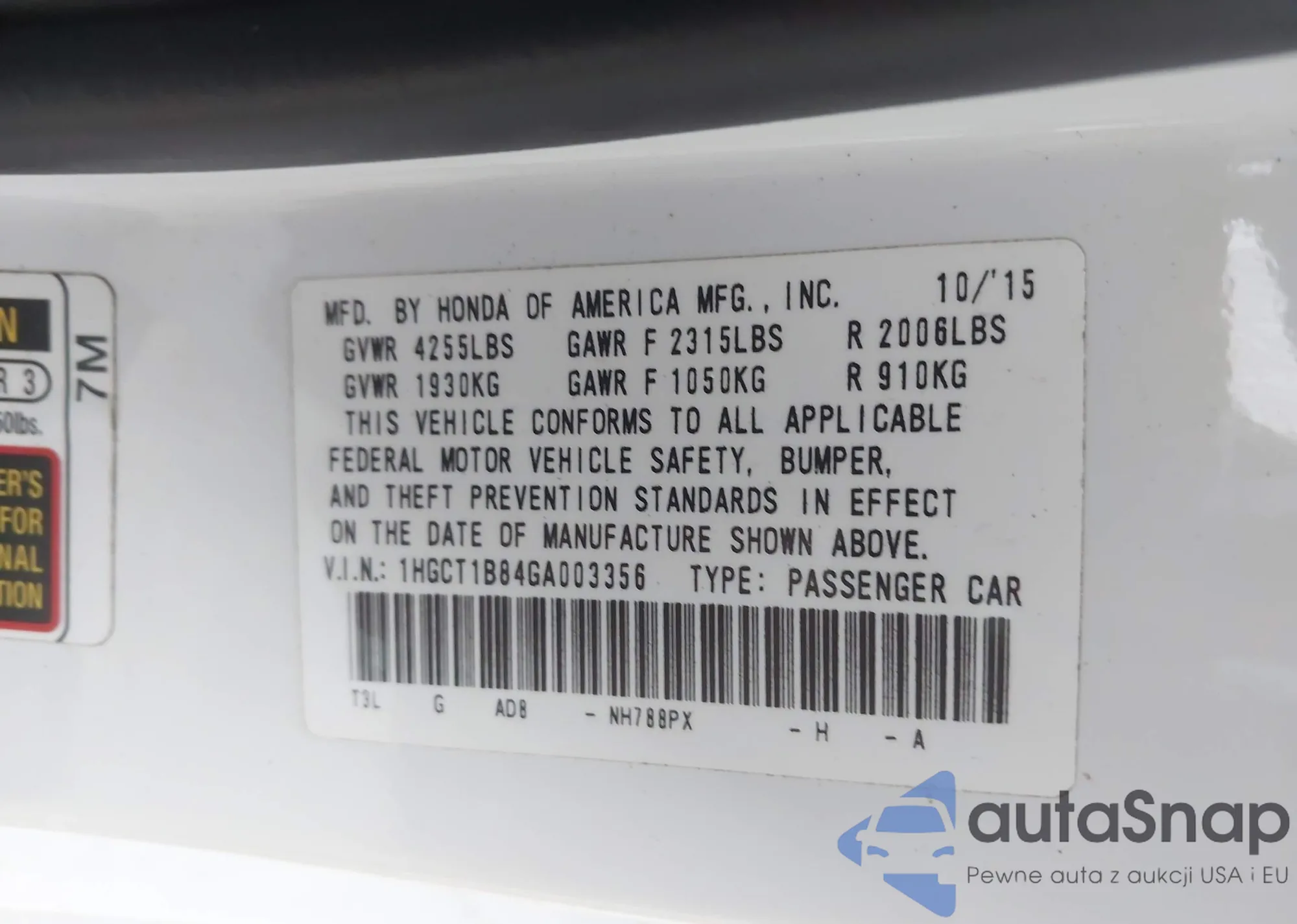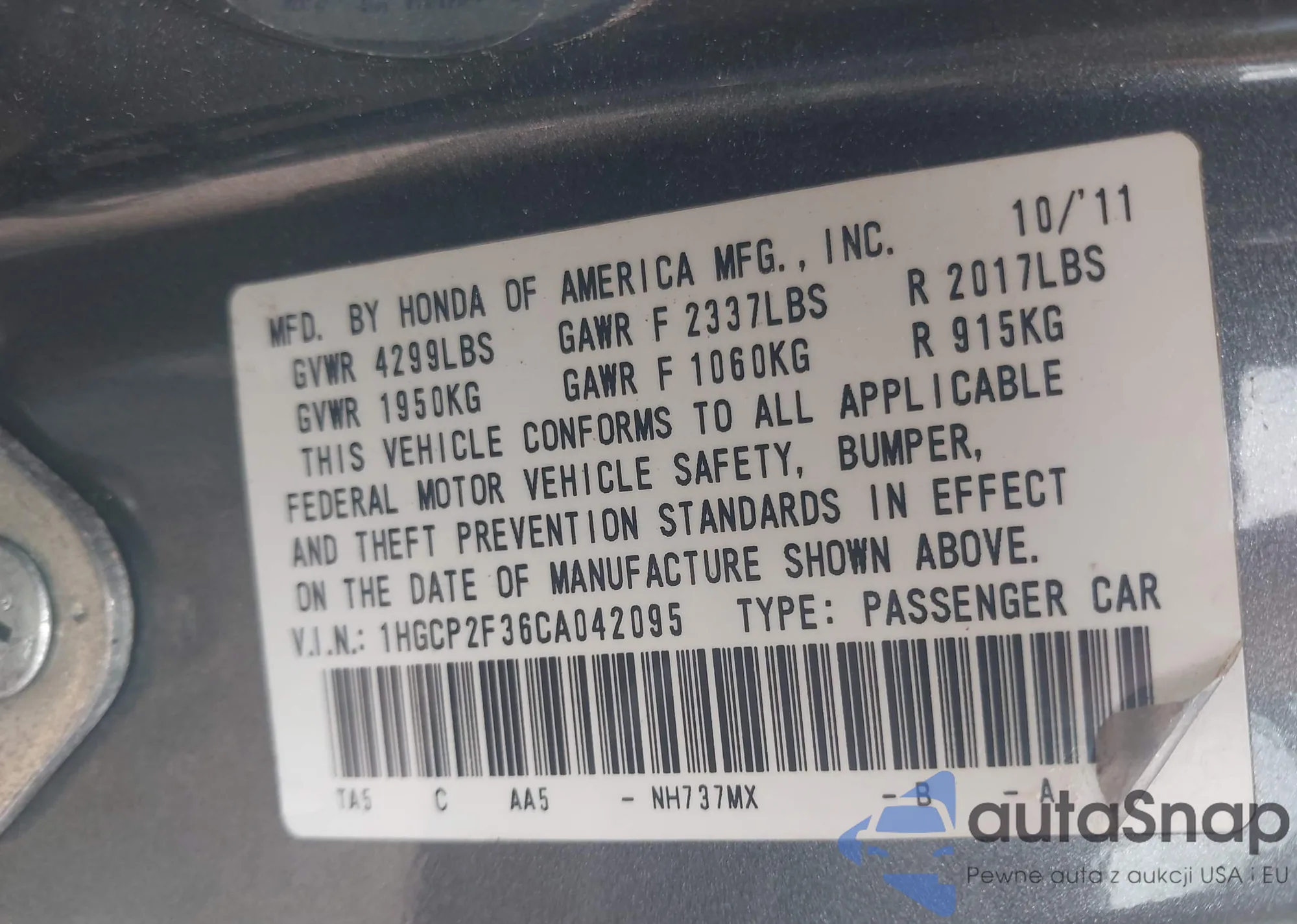 LOT: 43378474 VIN: 1HGCP2F36CA042095