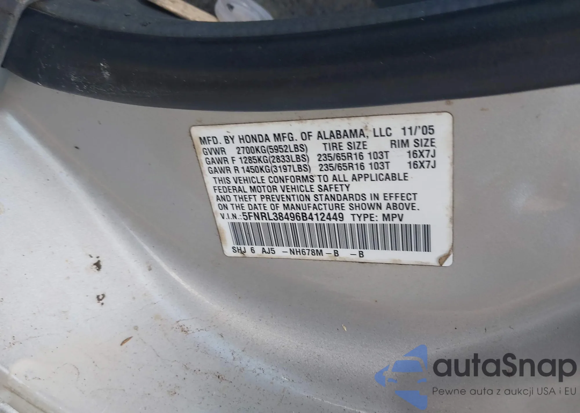 • VIN 5FNRL38496B412449