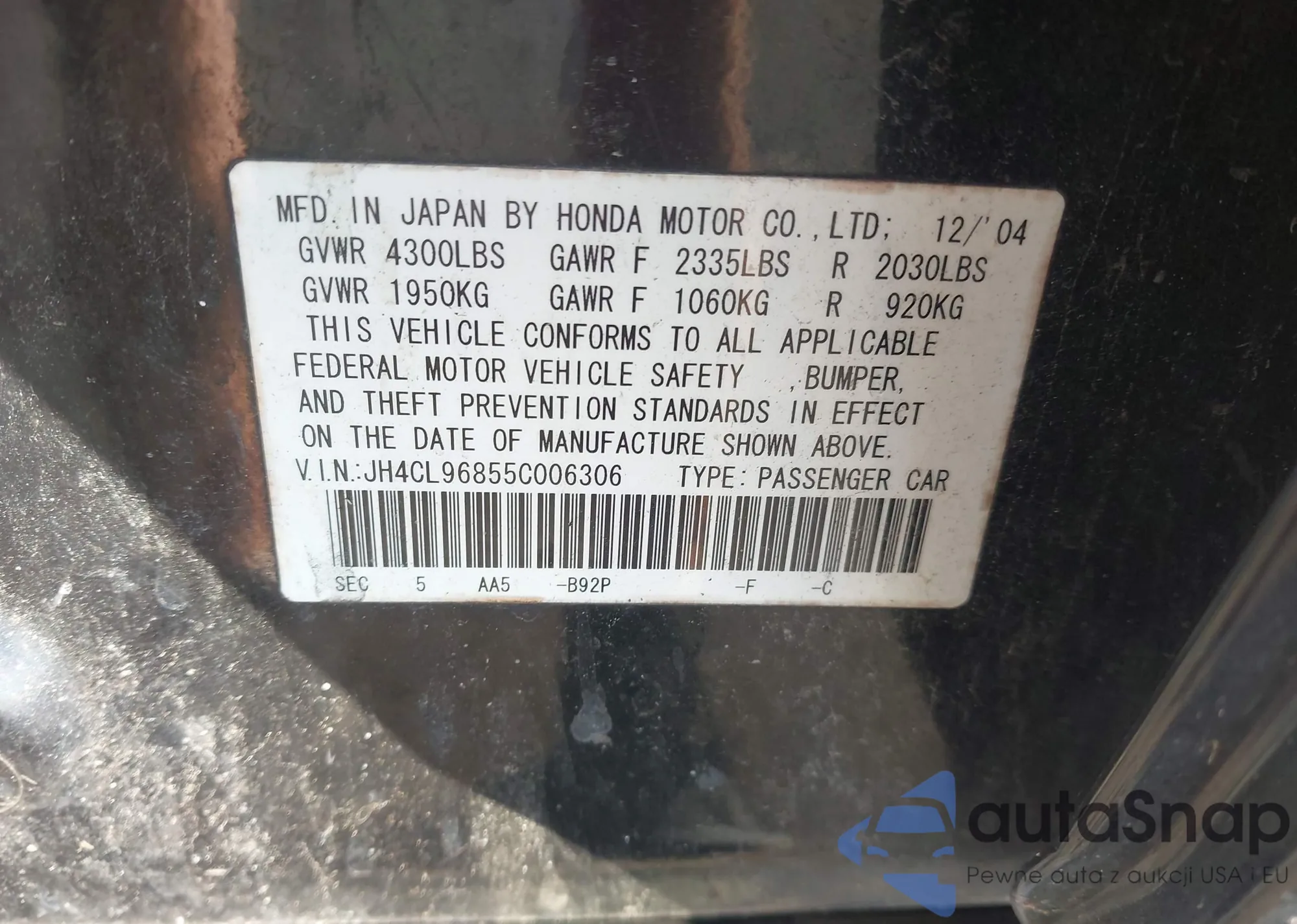LOT: 43320057 VIN: JH4CL96855C006306