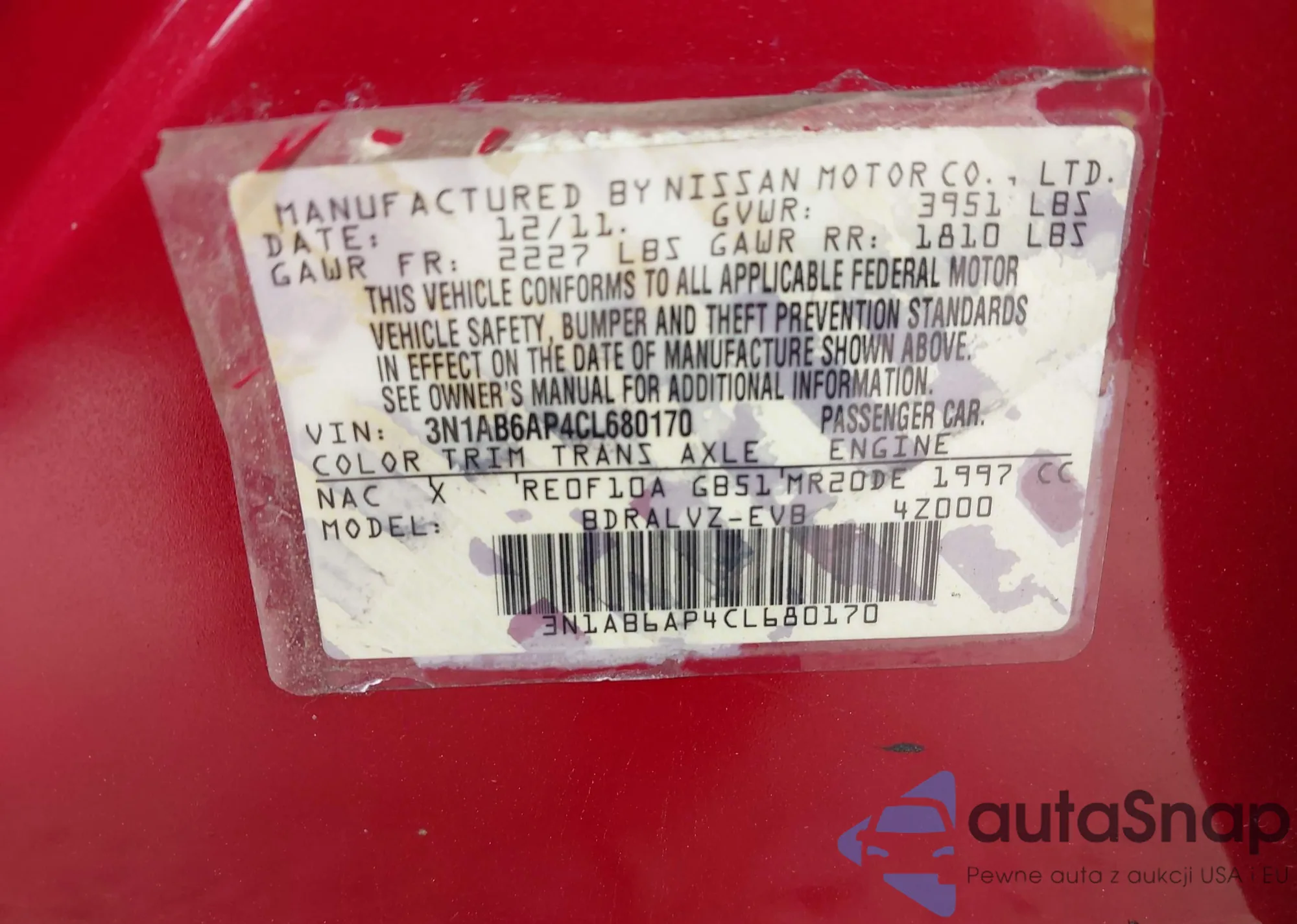 LOT: 43397280 VIN: 3N1AB6AP4CL680170