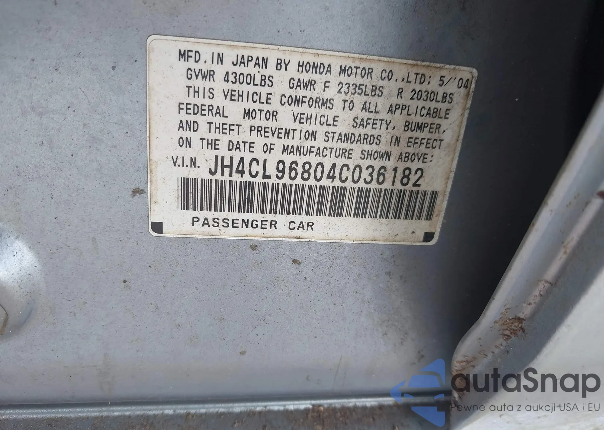 LOT: 43418637 VIN: JH4CL96804C036182