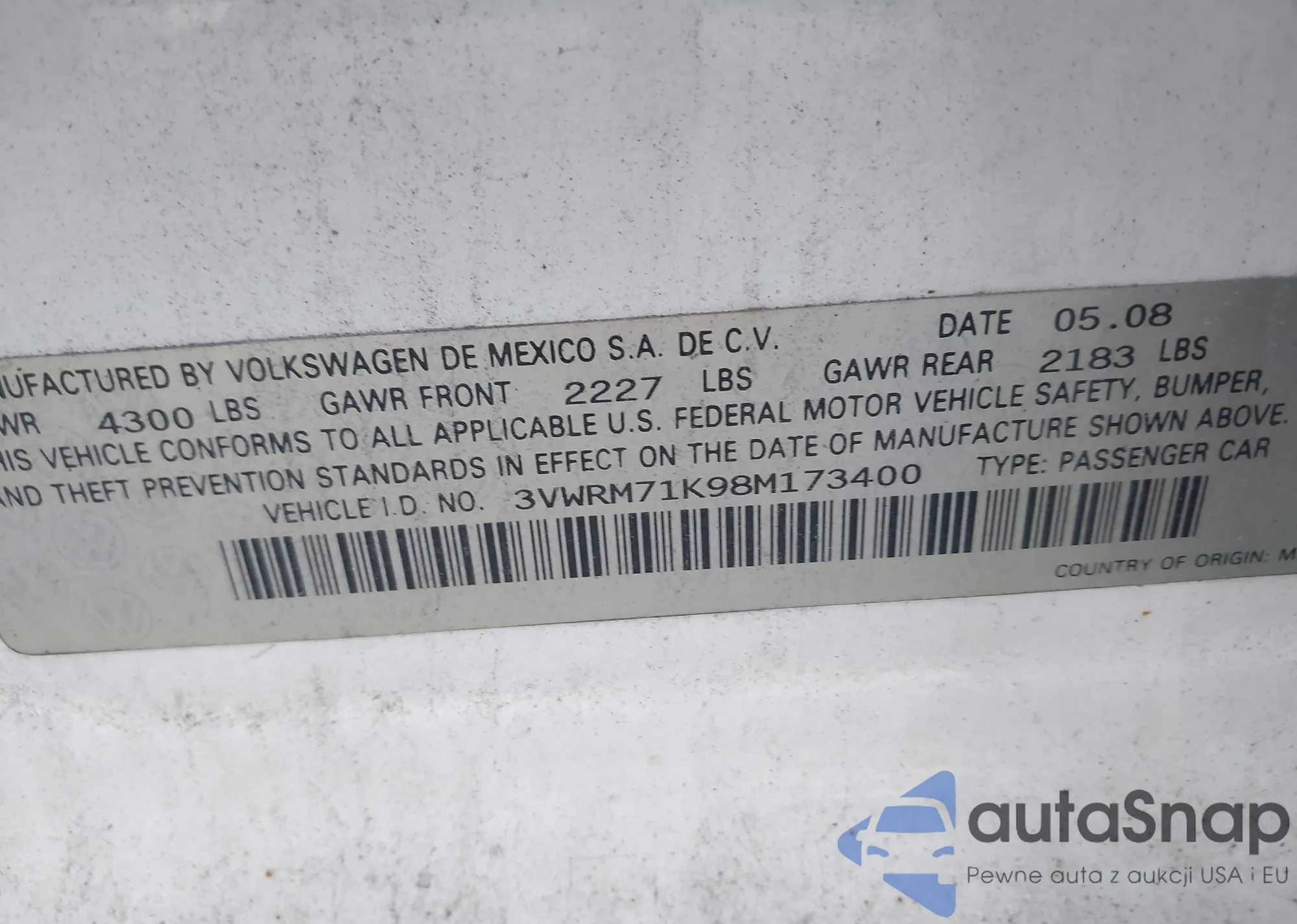 LOT: 43045786 VIN: WVWAA71F67V037600