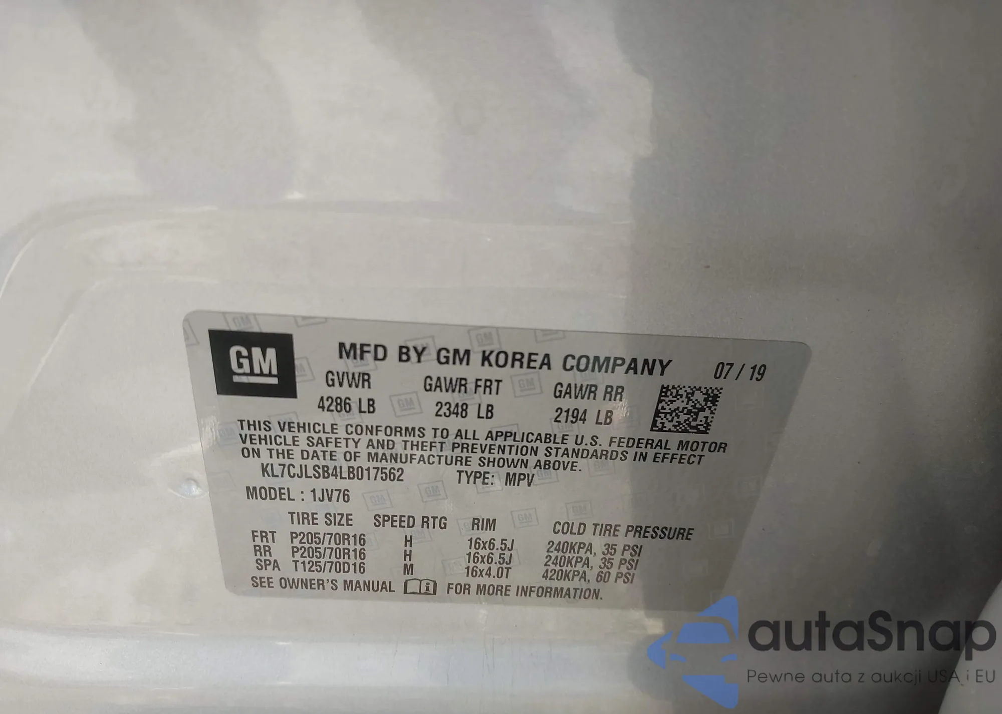 • VIN KL7CJLSB4LB017562
