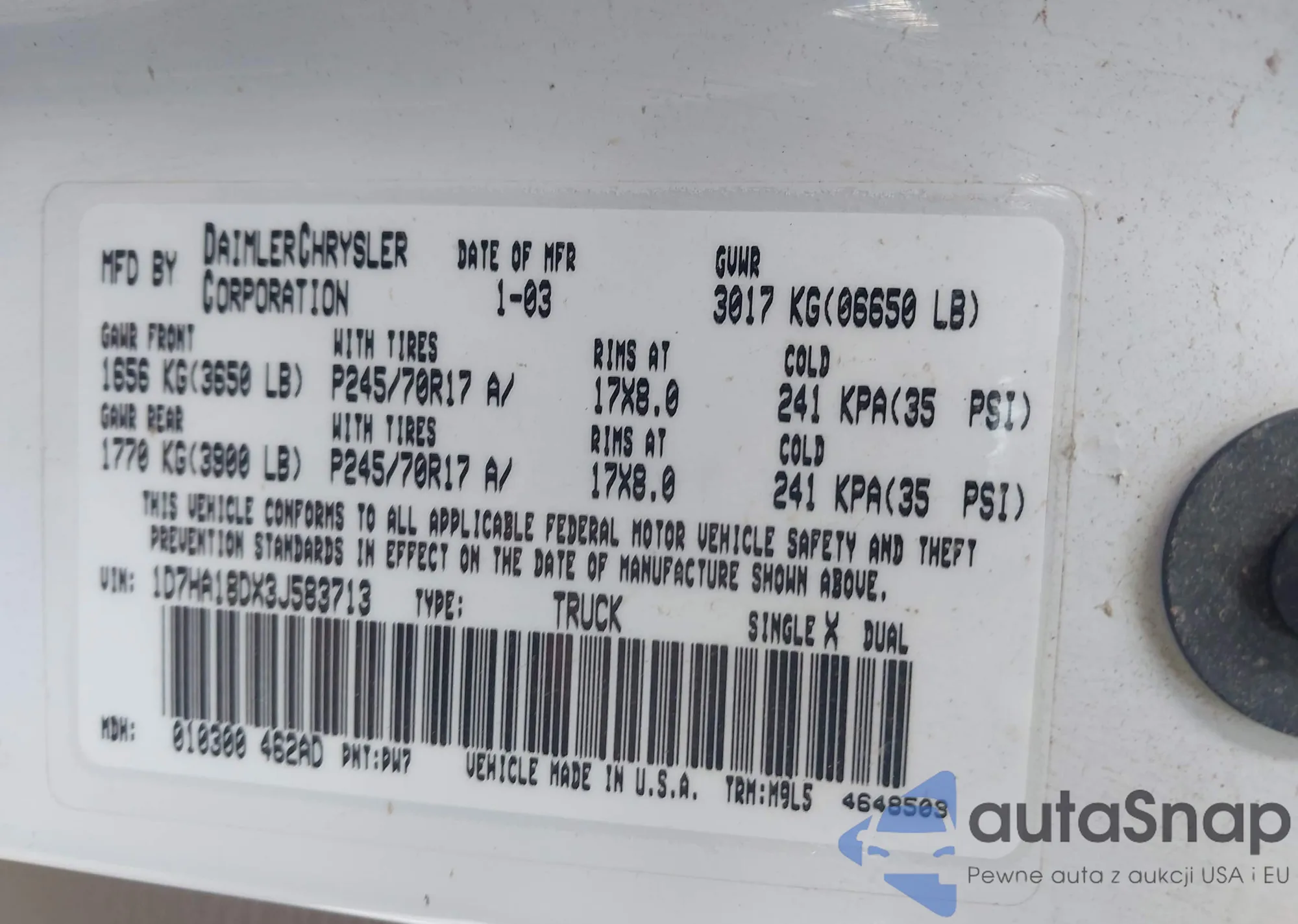 • VIN 1D7HA18DX3J583713