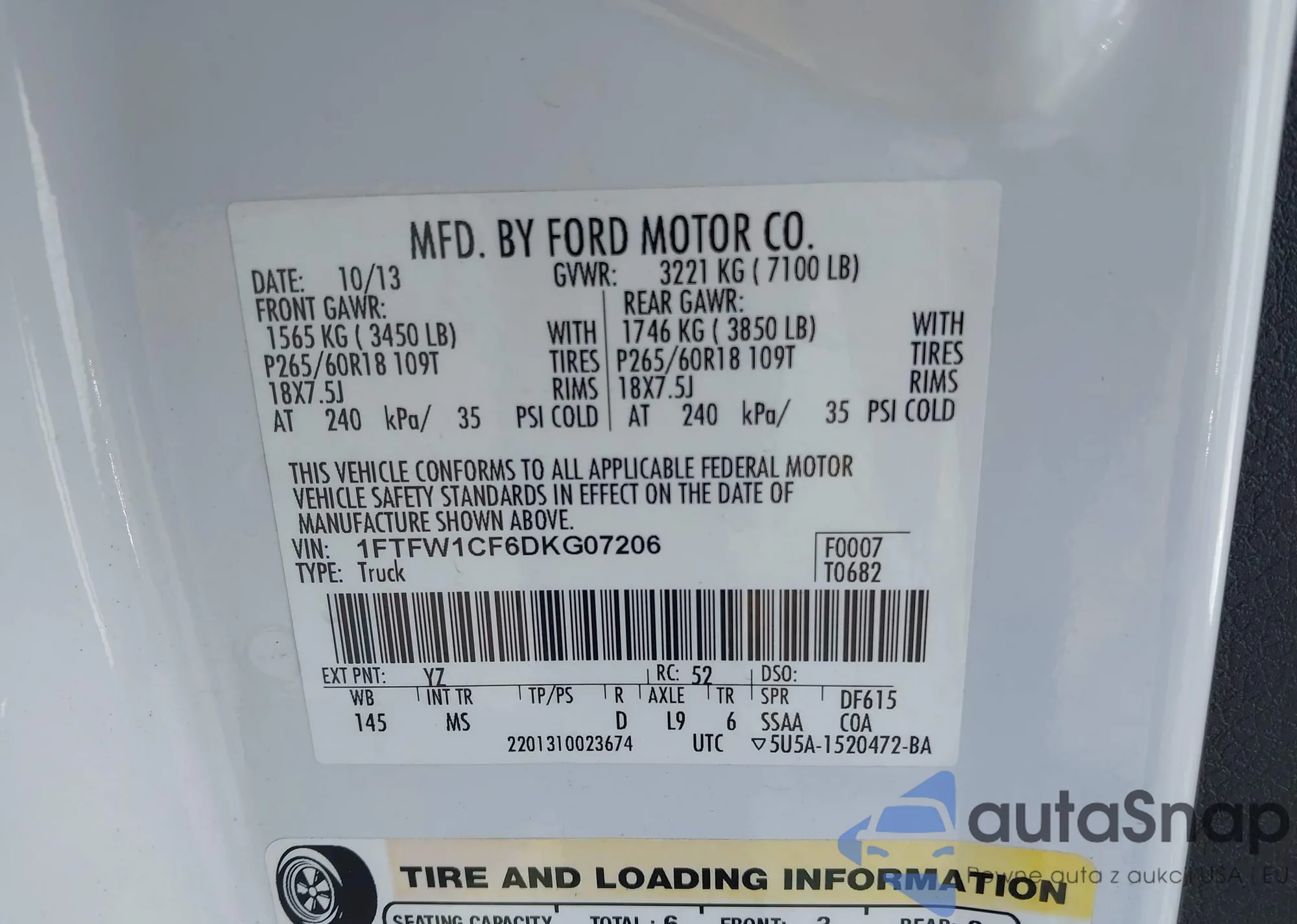 • VIN 1FTFW1CF6DKG07206